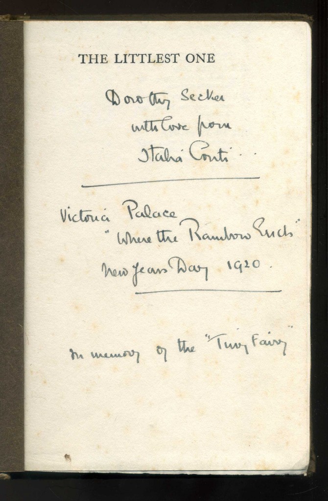 This copy has been signed by Italia Conti, the actress and founder of the Italia Conti Academy of Theatre Arts. She has signed "Dorothy Secker with love from Italia Conti / Victoria Palace "Where the Rainbow Ends", New Years Day 1920 / In memory of the 'Tiny Fairy'". Dorothy Secker was an actress in the play, Where the Rainbow Ends. It was during an earlier production of this play that the theatre manager Charles Hawtrey asked Conti to train the children, which led to the foundation of her acting school.