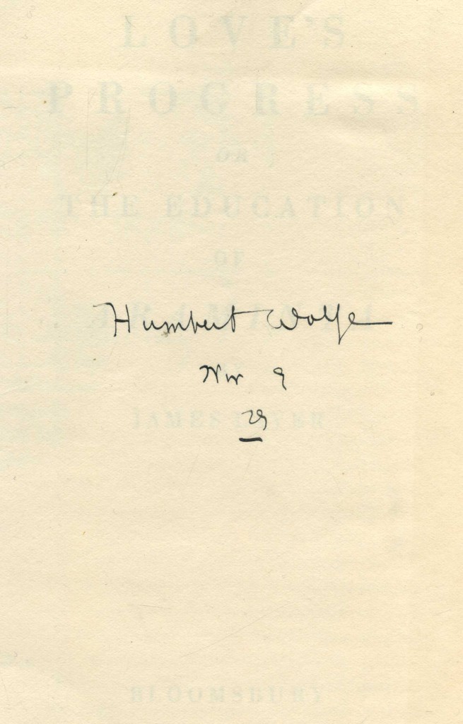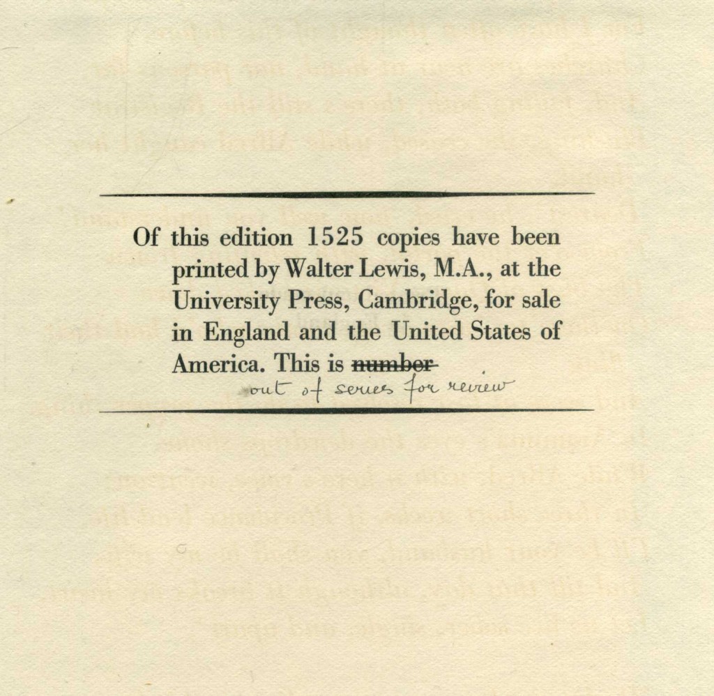 This copy has been signed and dated by the poet Humbert Wolfe. The limitation page has a handwritten annotation that this copy is "out of series for review".