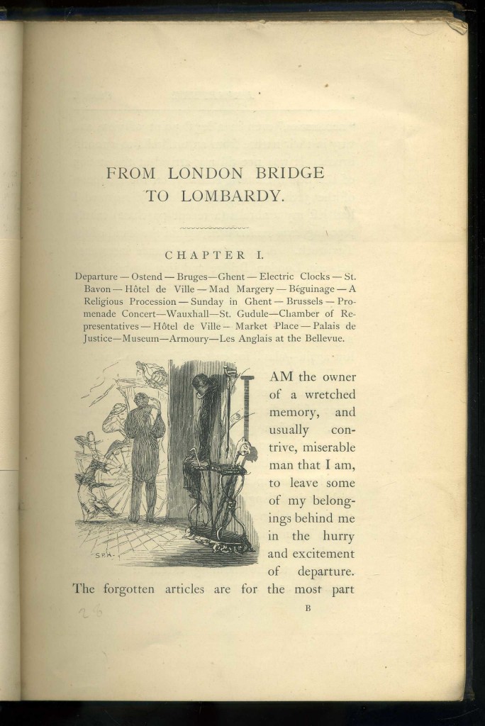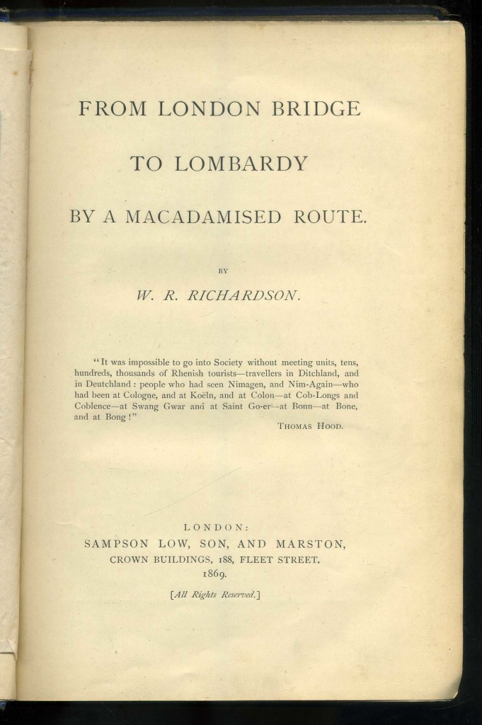 This is a rare first edition of W R Richardson's light-hearted and witty account of a trip taken from London Bridge to Lombardy in Italy by train and coach, describing how much easier it in in his day that his fore-fathers. He travels through Belgium, Germany, Switzerland, Italy, and France, observing the locals, their customs and art etc. The book is illustrated with a map of the route, and smaller illustrations within the text by Sydney Prior Hall.