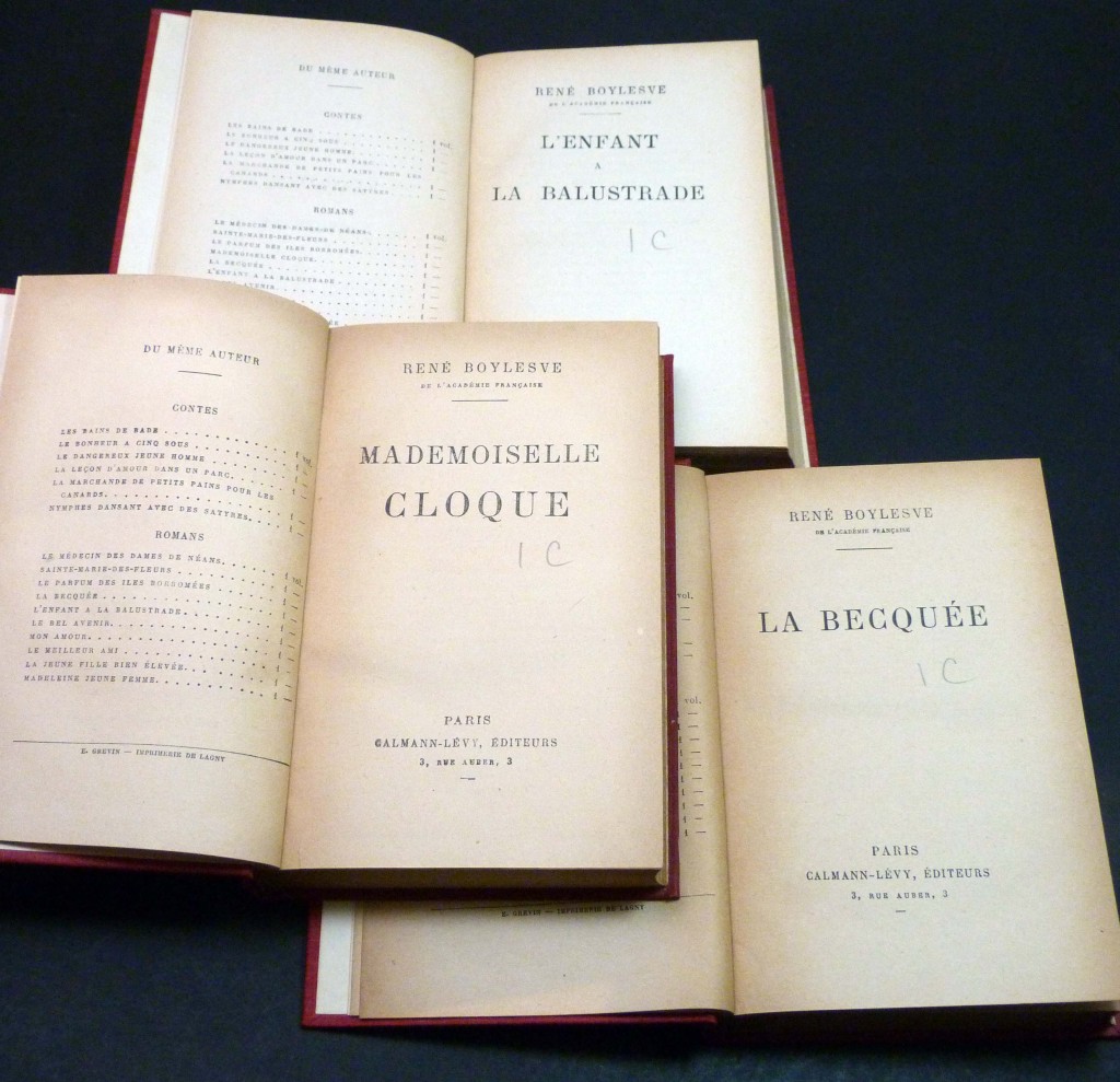 There are three books by Rene Boylesve, a French novelist considered the heir of Honoré de Balzac and precursor of Marcel Proust. All three books are hardback, rebound in plain red cloth and with title label to spine. French text.