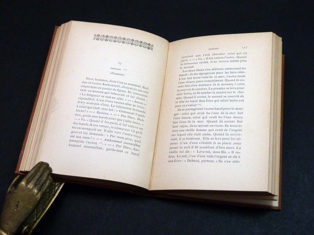 Published as part of the 'Collection de Contes et des Chanson Populaires' series, this rare book examines the myths, legends and songs of the Berbers of North Africa and explores the subterranean world of Djinns, Treasures, and Fairies in Berber cosmology. After an introduction and extensive bibliography, the book is in six sections: 1. Fables et Contes Animaux (Fables and Animal Tales), 2. Legendes Religieuses (Religious legends), 3. Legendes et Traditions Historiques (Historical legends and tradiitons), 4. Contes Merveilleux. Les Tresors, les Djinns, les Fees etc (Marvelous Tales. Treasures, Djinns, Fairies etc.), 5. Contes Divers (Miscellaneous tales), and 6. Poesies, chansons, enigmes, proverbes (Poems, songs, riddles, proverbs).