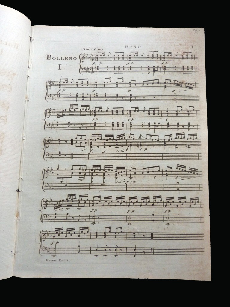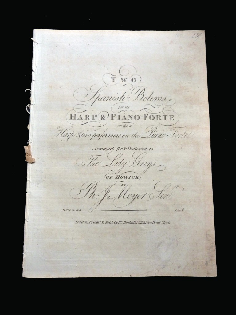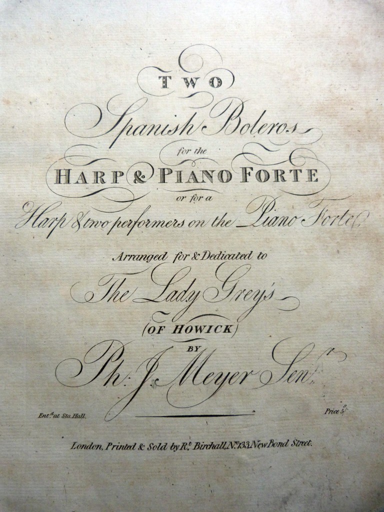 The harp music for Two Spanish Boleros by French harpist and composer Philippe-Jacques Meyer. This piece undated but entered in Stationers Hall in May 1810, and fitting with the publisher's address of 133 New Bond Street where Birchall operated from between 1791 and 1819.