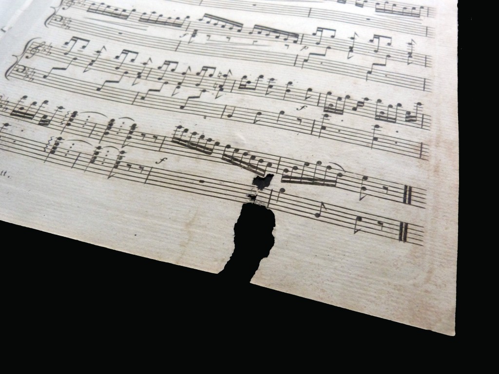 Fair condition. As mentioned, and as is usual for music of this age, the sheets are disbound. There is age-related tanning to the pages but the print and plate marks are readable.Page 3 has some wear to the fore-edge but not affecting text and page 3–5 has a small hole in the lower margin, the last page with some loss over the stave but it doesn't look like any notes have been erased. Please see the picture of this.