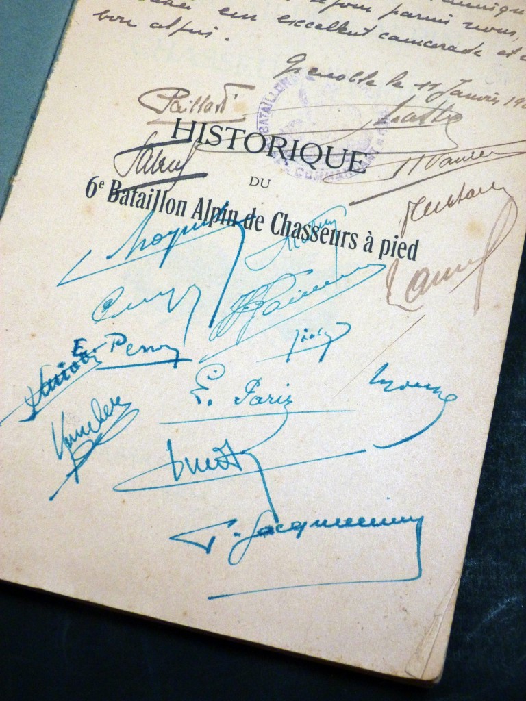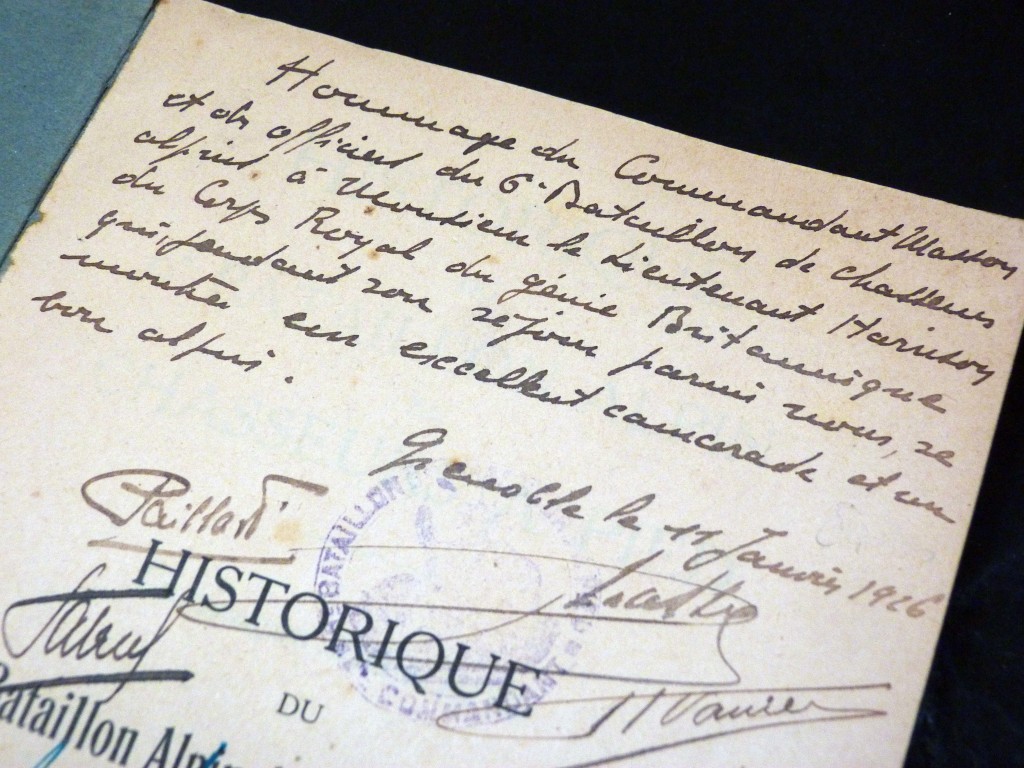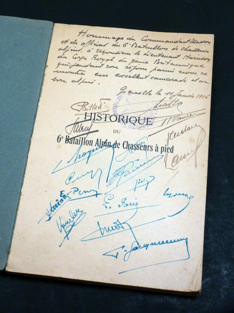 This copy has been signed by the Commanding Officer of the Battalion, and his officers, to a British officer, Lieutenant Harrison. There are eighteen signatures in total, and the inscription is dated Grenoble, January 1926. There are also two communications from British Army officials to Lt. Harrison which state that decorations from the French government are not sanctioned to be worn on parade. These are dated 1926 when Lt Harrison was serving in Poona, India.