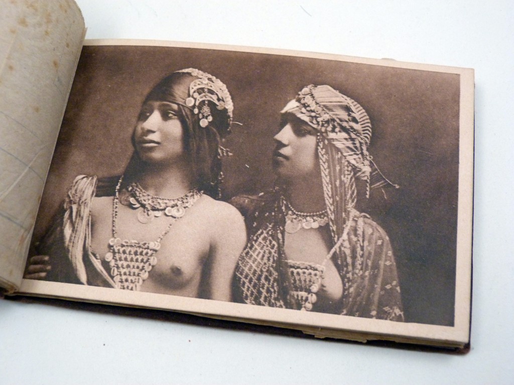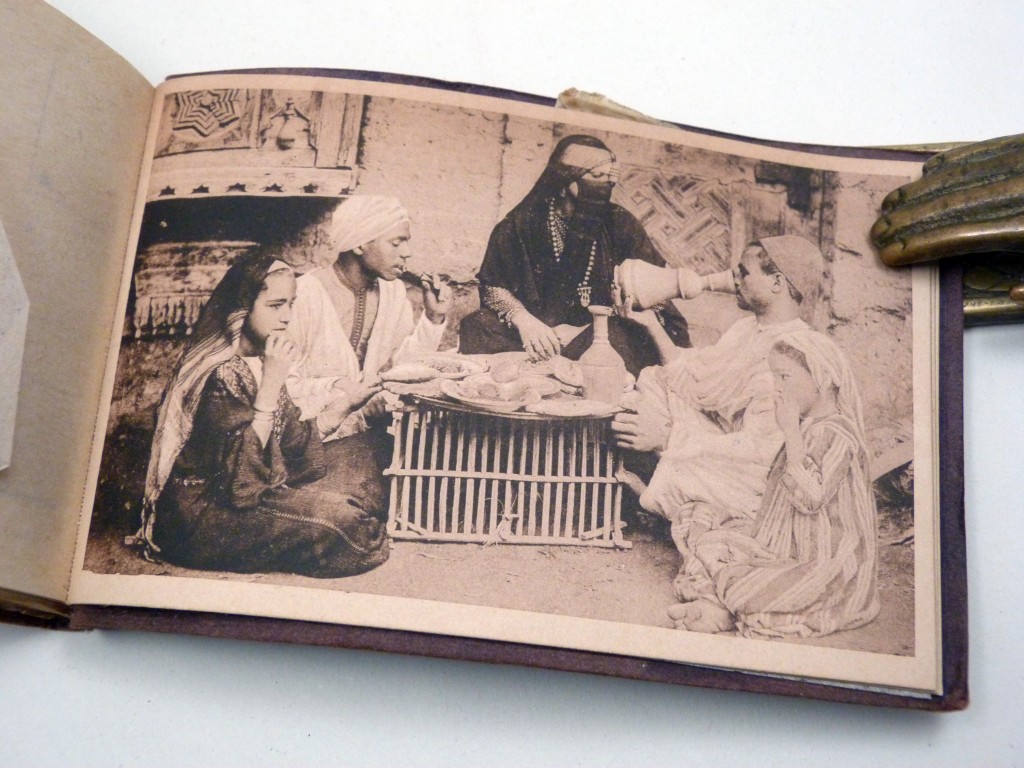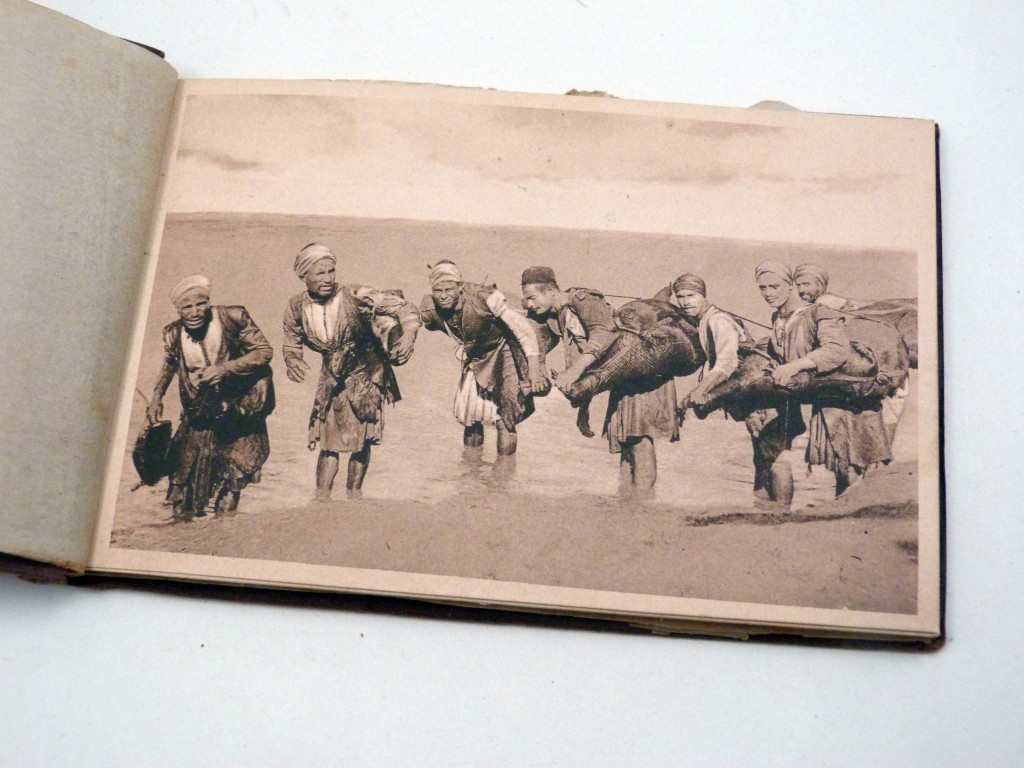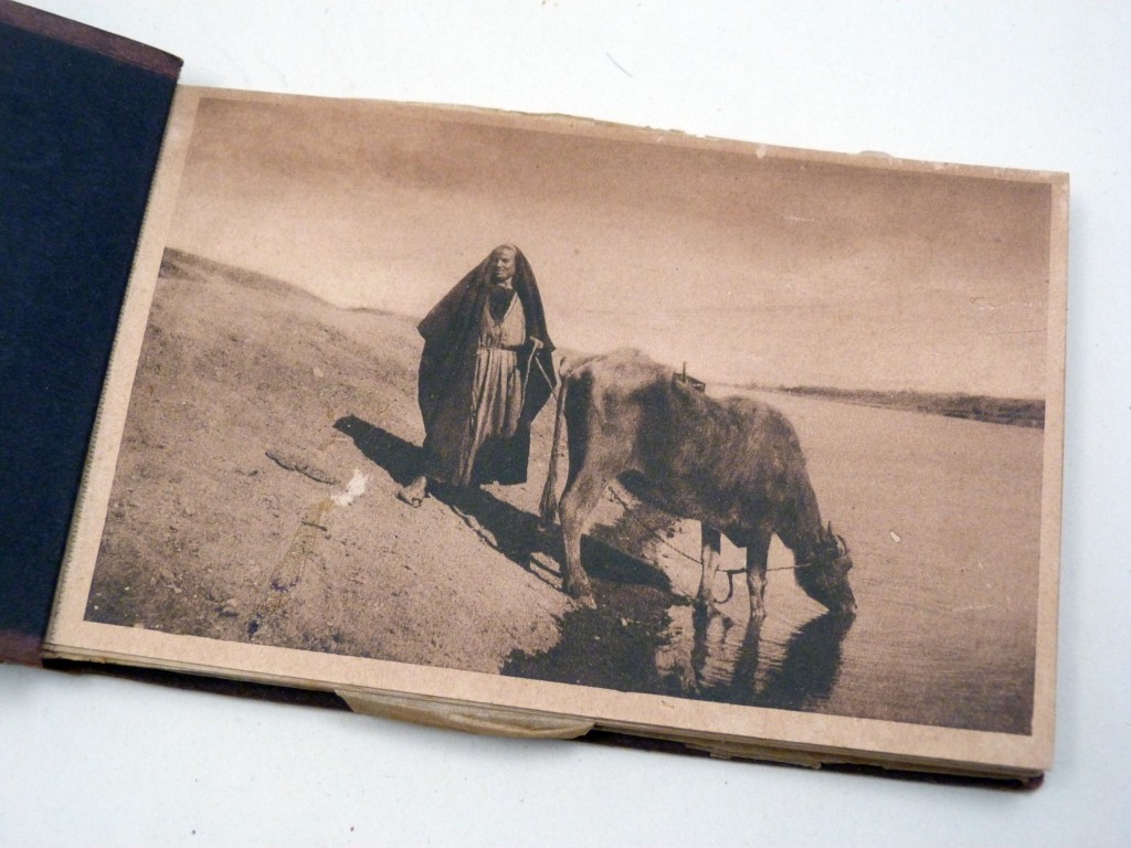 This booklet contains 21 of 24 sepia postcards of scenes of life in Egypt (Pyramid road, native girls, at the bank of the canal etc).