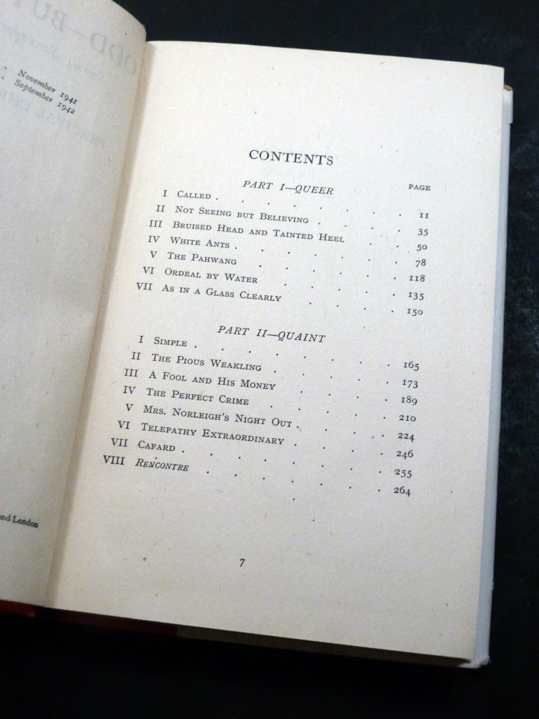 Fifteen short stories from the author of Beau Geste. The contents divided into two sections: Queer, and Quaint, and is a mix of adventure, heroism, romance, and the macabre, with three stories having a supernatural element.