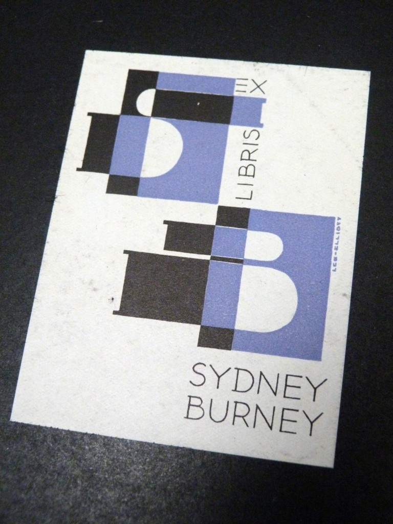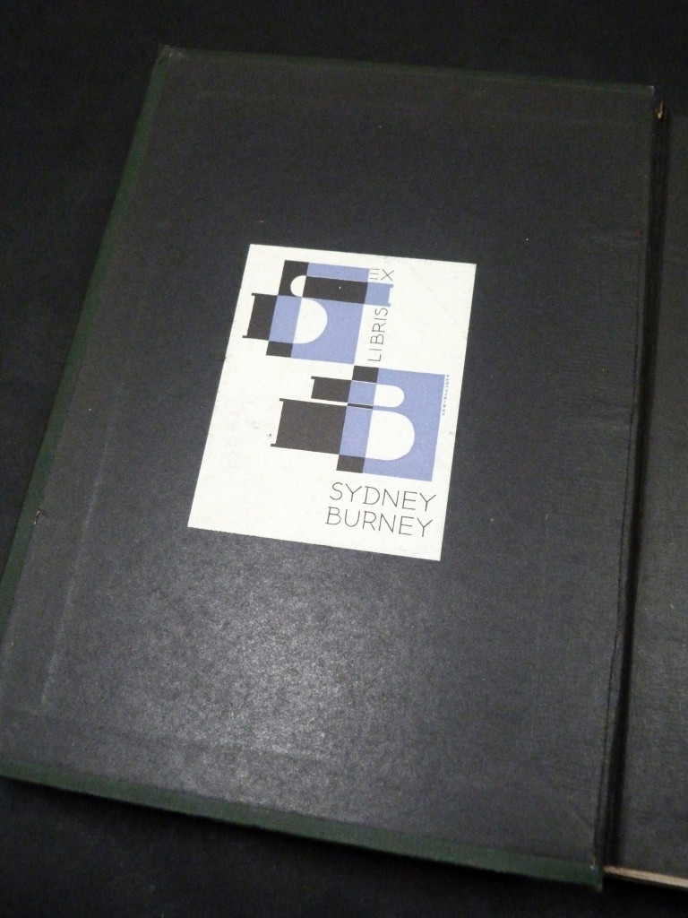 This copy with the bookplate of Sydney Burney by Lee-Elliott. Burney (1878–1951) was a British art and antiques dealer, Lee-Elliott (Theyre Lee Elliott, 1903–1988) was an English artist responsible for the design of well-known art deco logos (eg Speedbird), and was a stage designer for the theatre and ballet. This bookplate is quite early in his career, being dated to the 1930s, as per the Victoria and Albert Museum archive.