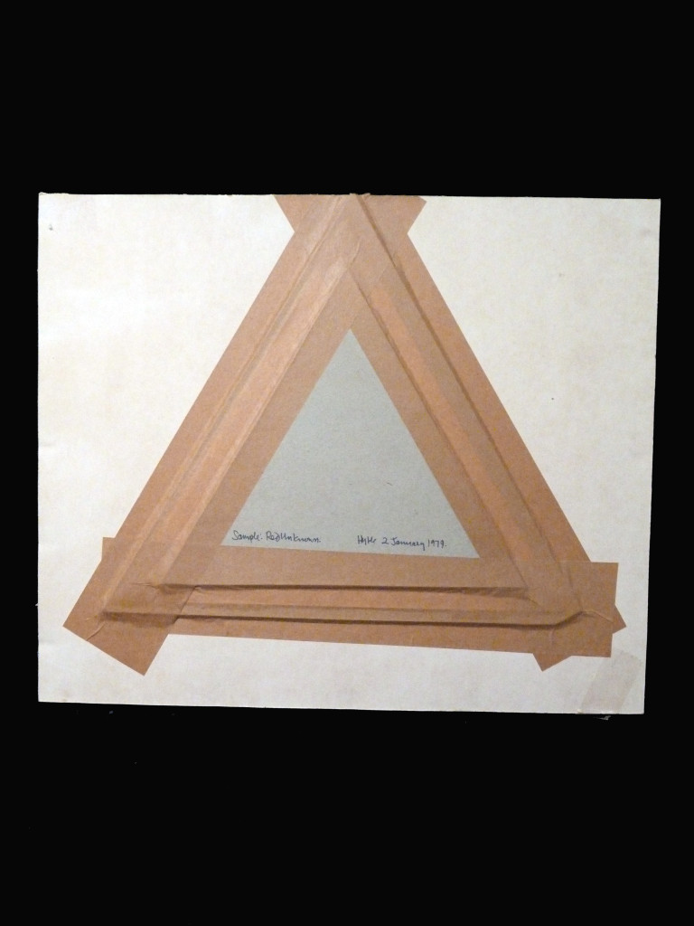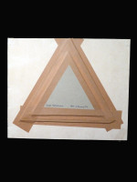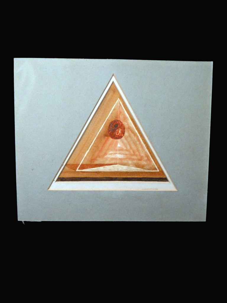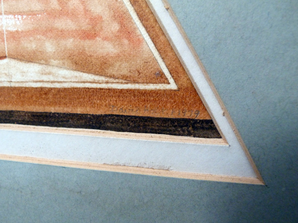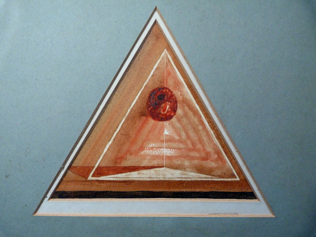 Painted in January 1979, this is a watercolour and ink on card. The image has been double mounted with the mount echoing the image in its triangular shape. The frame measures 28 × 32 cm.