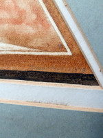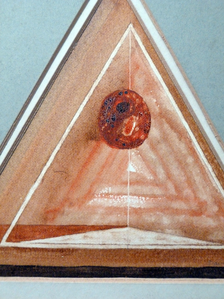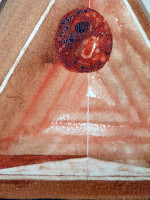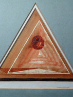 This is a work of abstract expressionism. It depicts a red gem-like sphere suspended inside triangular shapes which have a three-dimensional appearance giving the painting depth. The additional of the double mounting in the same shape of the image adds to the impression of distance and depth.