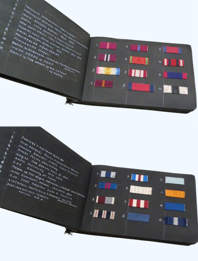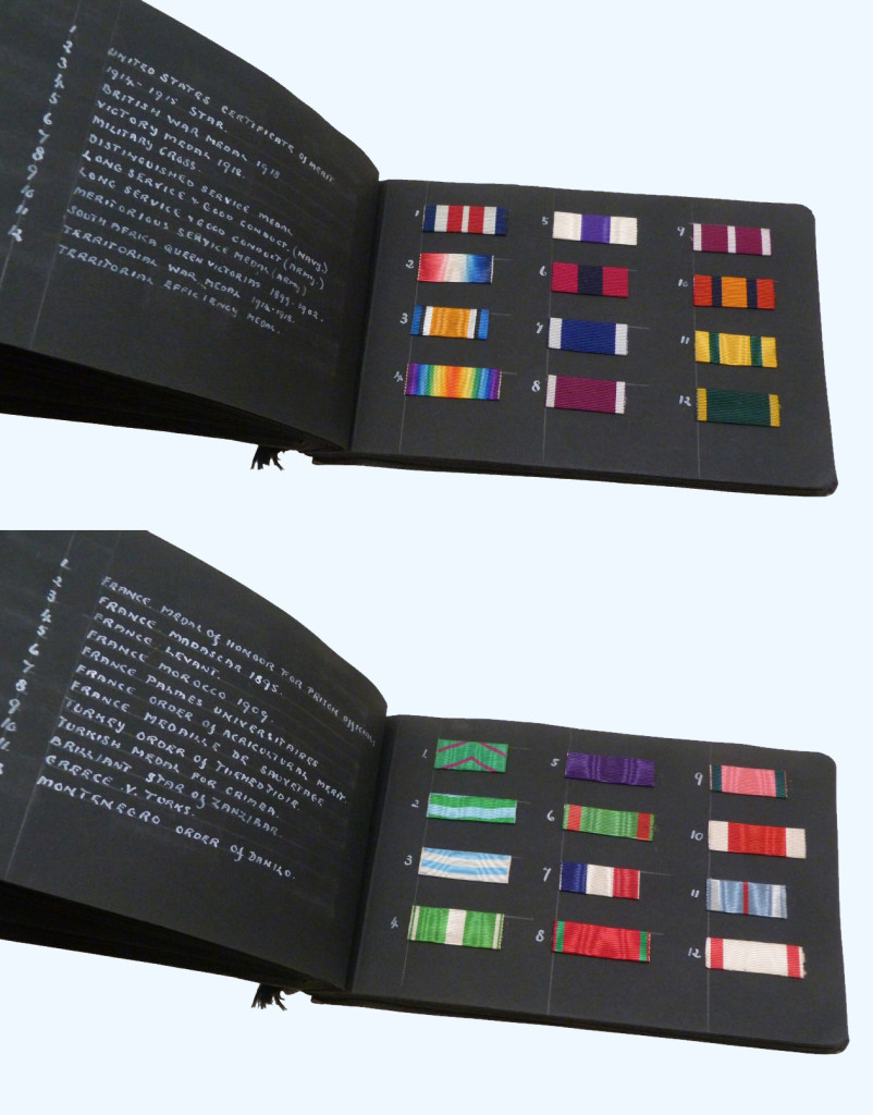 This album is in very good condition for age. There is some mottling to the covers but it remains well-bound, and the pages and photographs are clean. The medal ribbons are in very good order, mostly very clean, with some of the older ones showing a little age-related dulling but nevertheless remaining bright. The handwriting remains clear and crisp, and no ribbons are loose.
