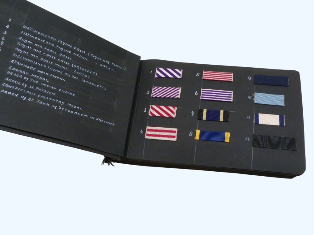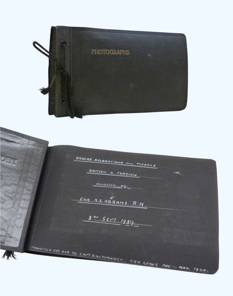 The album measures 13.5 × 22cm, it is strong-bound and every page has been filled. The handwritten title page reads "Orders, Decorations and Medals, British and Foreign, collected by Gnr A S Abrams, RA, 3rd September 1939. Mounted and Set Out by Capt D W Warren. Sick Leave Aug-Nov 1940". This is followed by 30 pages of medal ribbons and details, with the ribbons being recto and the text (in white ink) verso. The ribbons are all about 3 to 3.5cm long, and numbered. They are: