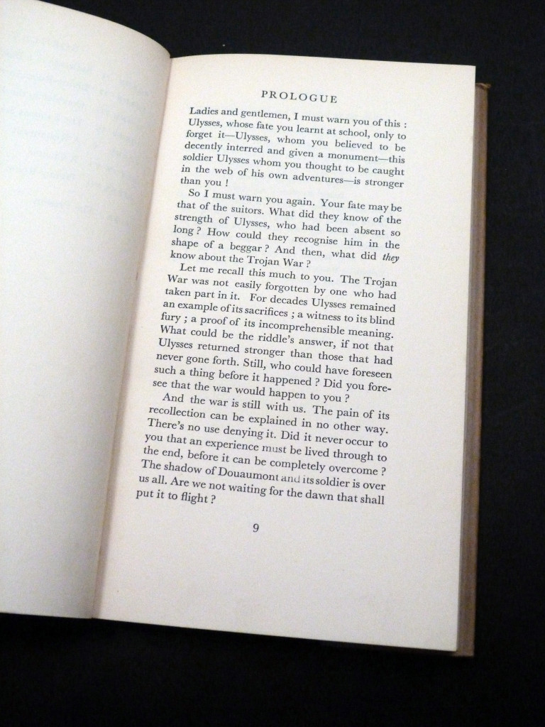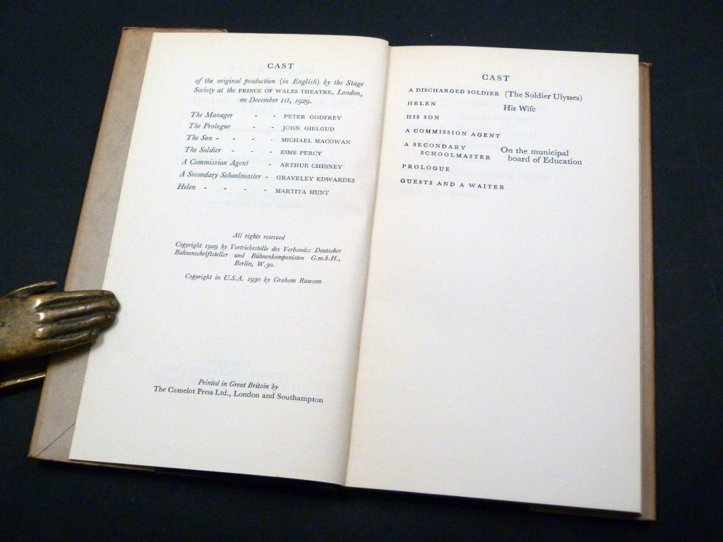 This Great War play from Eberhard Möller was his first critical success in 1929, and featuring as the main character a discharged soldier called Ulysses, and his wife (Helen), and with each scene starting with a passage from The Odyssey. Scene six caused a stir when it was first produced as Ulysses tears a cinema screen that is showing a war film to allow it to be screened on his bare chest. Eberhard Möller was to become one of the most famous authors of the Nazi era and was appointed to the Reich Ministry for Public Enlightenment and Propaganda.