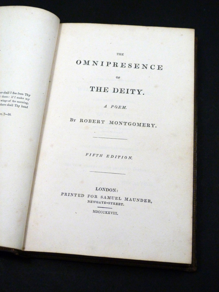 A very popular religious poem on its publication in the same year as this fifth edition. The Omnipresence and its notes runs to 131 pages, and this is followed by a further fifteen of Montgomery's poems.