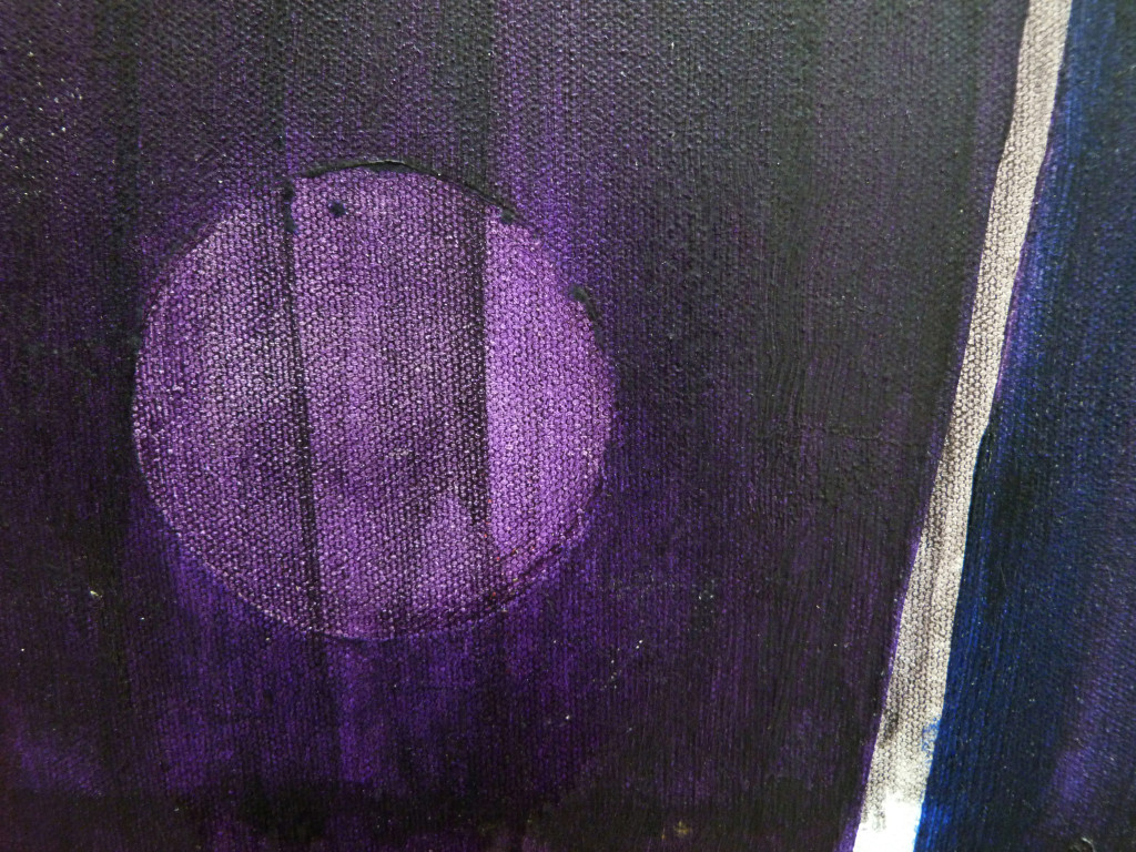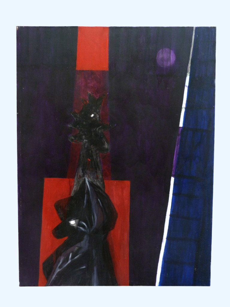 A dark and brooding abstract painting depicting two dark figures against red shaped blocks, an angled white line running from top to bottom, and under a purple / mauve moon. This painting is testimony to David Holt's lifelong admiration of Francis Bacon.