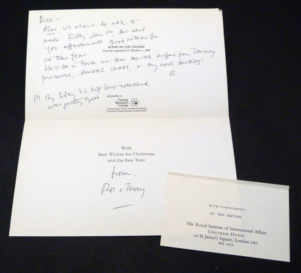 Not signed as such but loosely inserted in volume one is a small compliments slip from author, and a handwritten Christmas card to Dick, from Ros and Terry (Rosalyn Higgins, and her husband, the conservative politician, Terence Higgins). Dick was Professor Richard N Swift, an expert in International Law who worked with the UN.