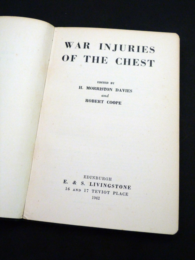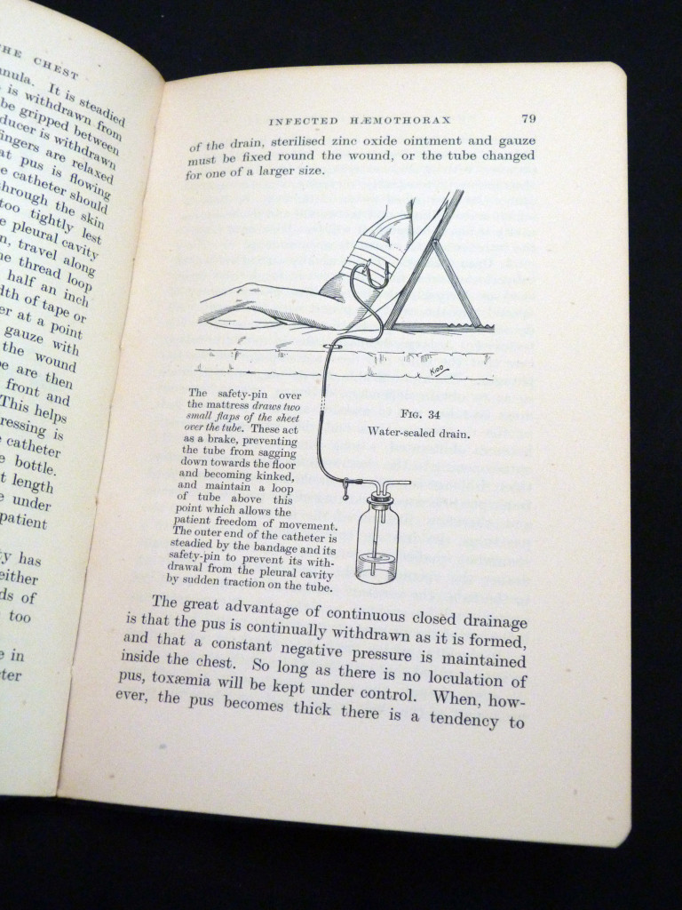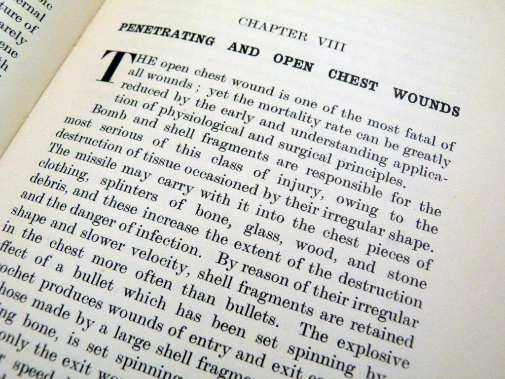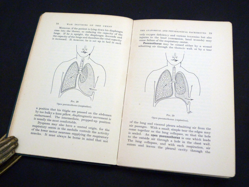 A Second World War handbook to chest injuries caused through war, with chapters such as "Penetrating and Open Chest Wounds" and "Infected Haemothorax", and with a few illustrations within the text.
