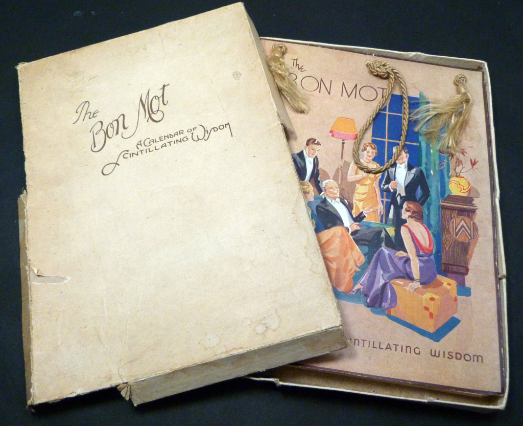 An unused witty 1936 calendar. The front cover showing a wit holding court to five Bright Young Things... The calendar is arranged as a week per page, with a motto above, for example: "Some pianists play from note, some from ear, and some from spite", or "The average man is proof enough that a woman can take a joke".
