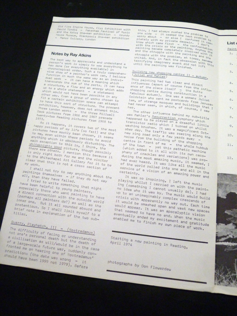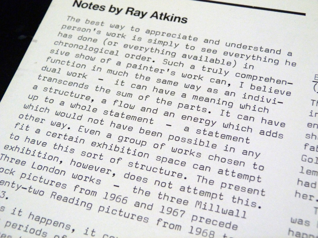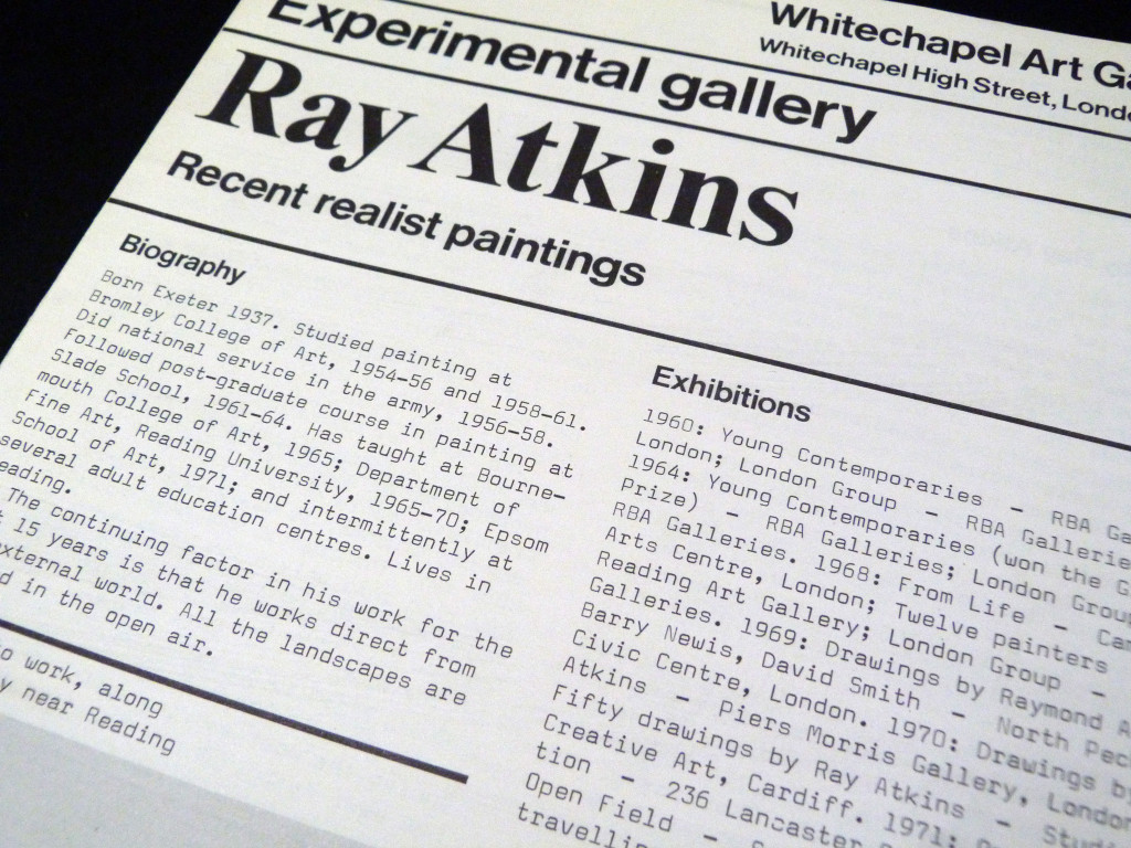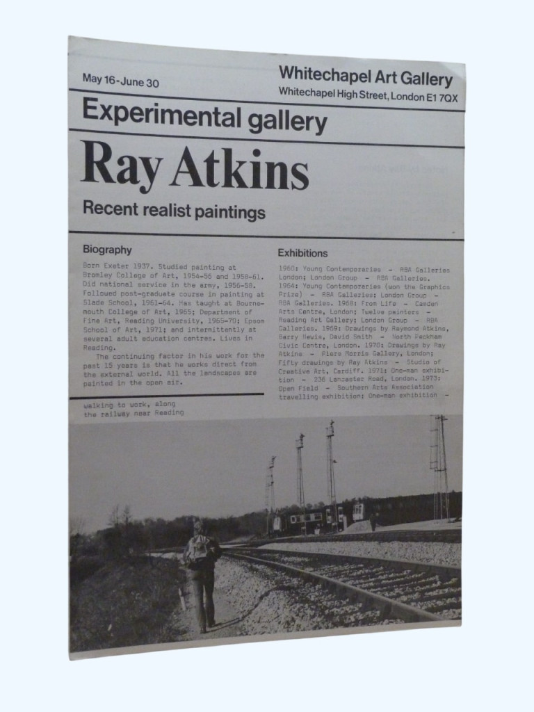A 1974 exhibition pamphlet from the Whitechapel Art Gallery's Experimental gallery, showing the work of Ray Atkins, the British figurative artist, member of the St Ives School & the London Group. It is essentially a piece of A3 paper, printed on all sides and folded once. It gives a brief biographical notice and exhibition history, followed by a page of notes by the artist. Illustrated with two photographs of the artist and one of his work. This was the artist's second major exhibition.