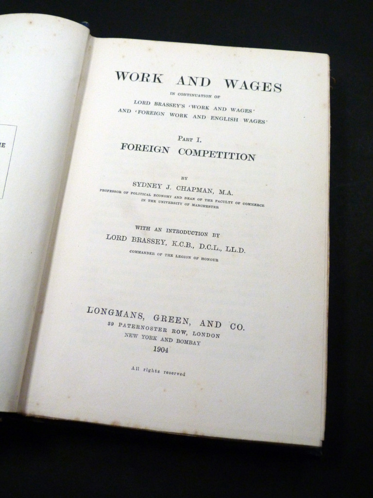 Signed by Sydney J Chapman, his 'Continuation of Lord Brassey's 'Work and Wages' and 'Foreign Work and English Wages' Vol 1: Foreign Competition, and Vol 2: Wages and Employment'