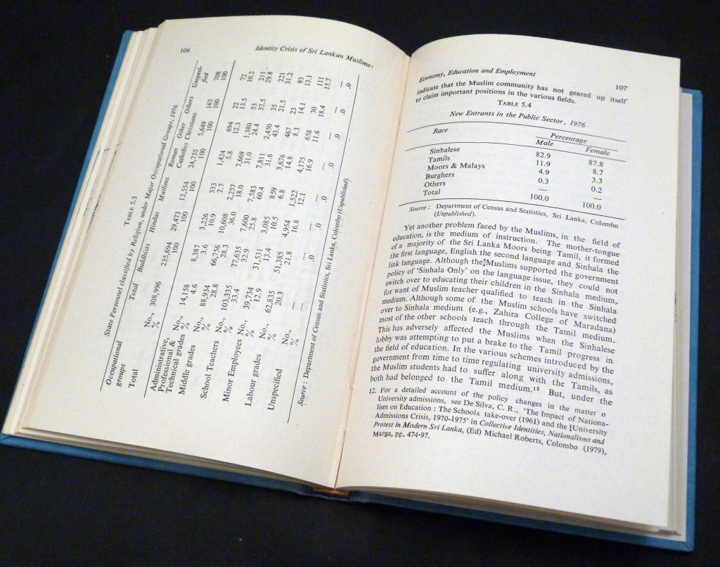 "Muslims are one of the important constituents of the plural society of Sri Lanka, inhabiting the island with the majority Sinhalese and the minority ethnic Tamils for centuries, while maintaining a religious identity of their own. However, when the Tamils tried to prove that the Muslims, whose mother tongue is also Tamil, were Tamil-converts to Islam, the Muslims feared being merged in the Tamil-stream. Consequently, and for political reasons, they broke away from the Tamils and as Independence approached, threw their lot with the Sinhalese. Such a decision did not, however, make things easier for the Muslims. They could neither erase the Tamil culture ingrained in them over the centuries nor could adopt Sinhala as the mother tongue. To set themselves apart, the Muslims chose to build up a distinct identity for themselves, based on their claim of Arab descent. This work deals with the dynamics of Muslim ethos in the multi-racial society of Sri Lanka and is the first of its kind on the subject." Illustrated with maps and tables.