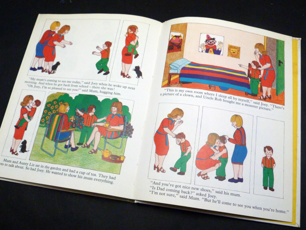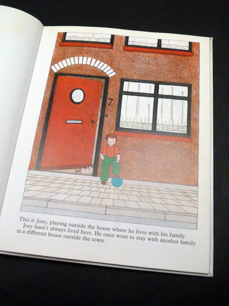 From the back cover, "Joey is one of the thousands of children who live with a foster family. This is Joey's story. His distress about his troubled family, his anxieties over leaving home for strange food and a strange bed, are dealt with honestly and imaginatively, and he is shown gradually settling into a happy routine with kind and caring foster parents.