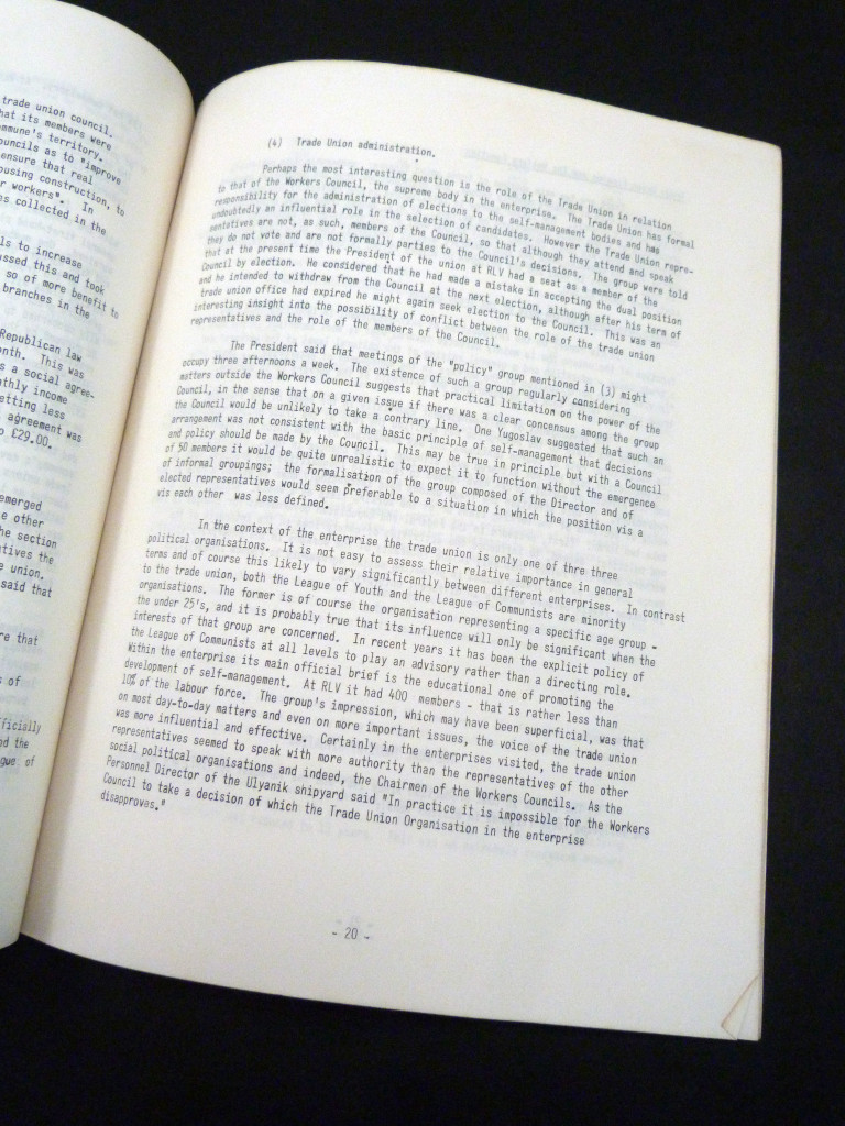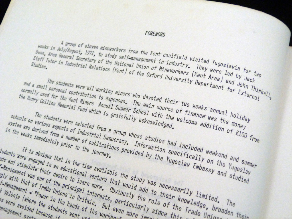 A report from the National Union of Miners (Kent Area) after eleven Kentish miners visited Yugoslavia to study self-management in industry. There was a study of the mines at Velenje and Labin, mostly to understand the technique of "power in the hands of the workers".