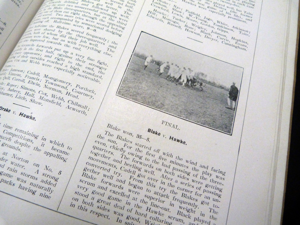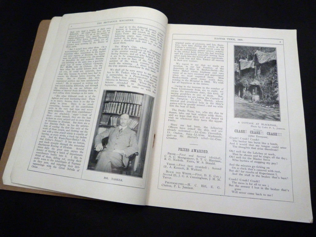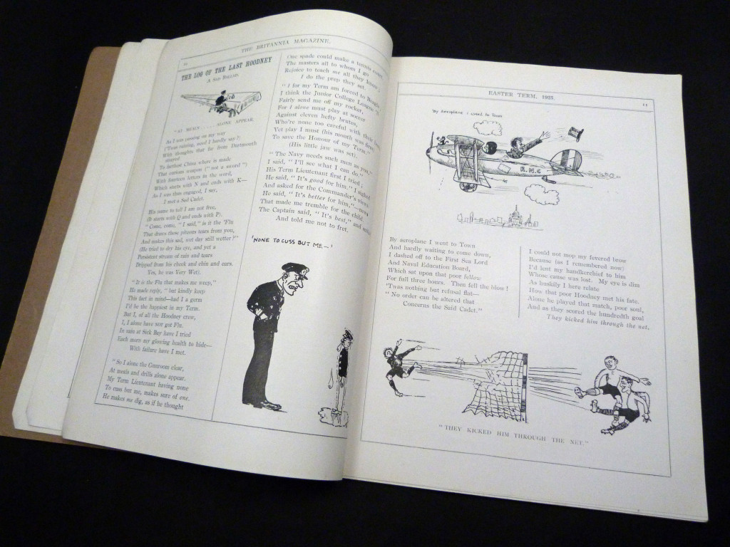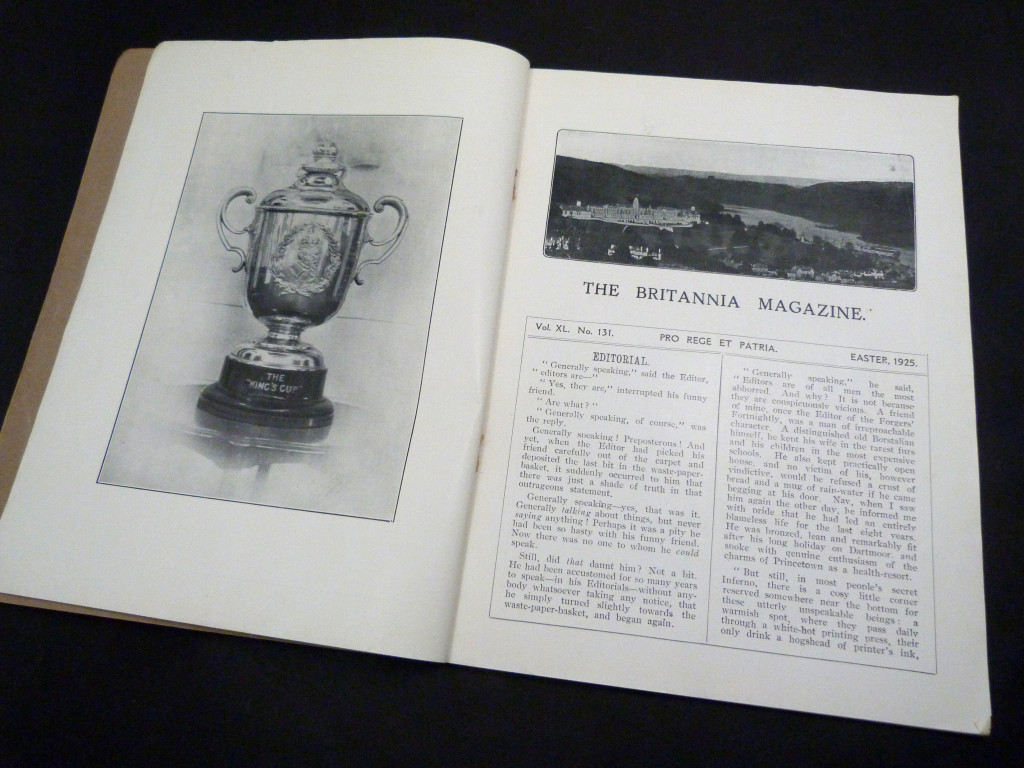 A scarce early issue of The Britannia Magazine, the journal for the Cadets at the Royal Naval College in Dartmouth. The magazine was founded in 1884, and at this time in its history was published three times a year (Easter, Midsummer, and Christmas). This magazine contains photographs, an editorial, sports and recreation, cartoon, letters from cadets etc, and with sports results for the season. This issue contains a frontispiece of The King's Cup, an address at the College Chapel by Vice-Admiral Ronald A Hopwood, house reports and notes, rugby match reports and results etc. The last three pages of text are the names of the officers, masters and full list of cadets, with a group shot of the Drake Term.