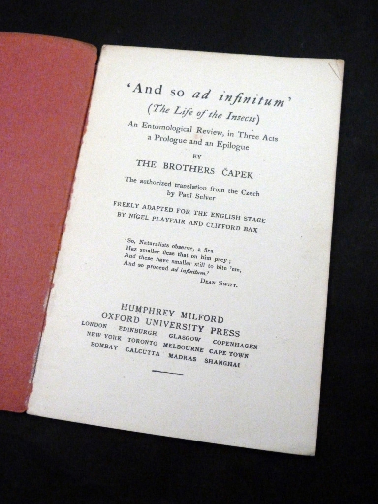 Full title: And so ad infinitum (The Life of the Insects). An Entological Review, in Three Acts, a Prologue and an Epilogue