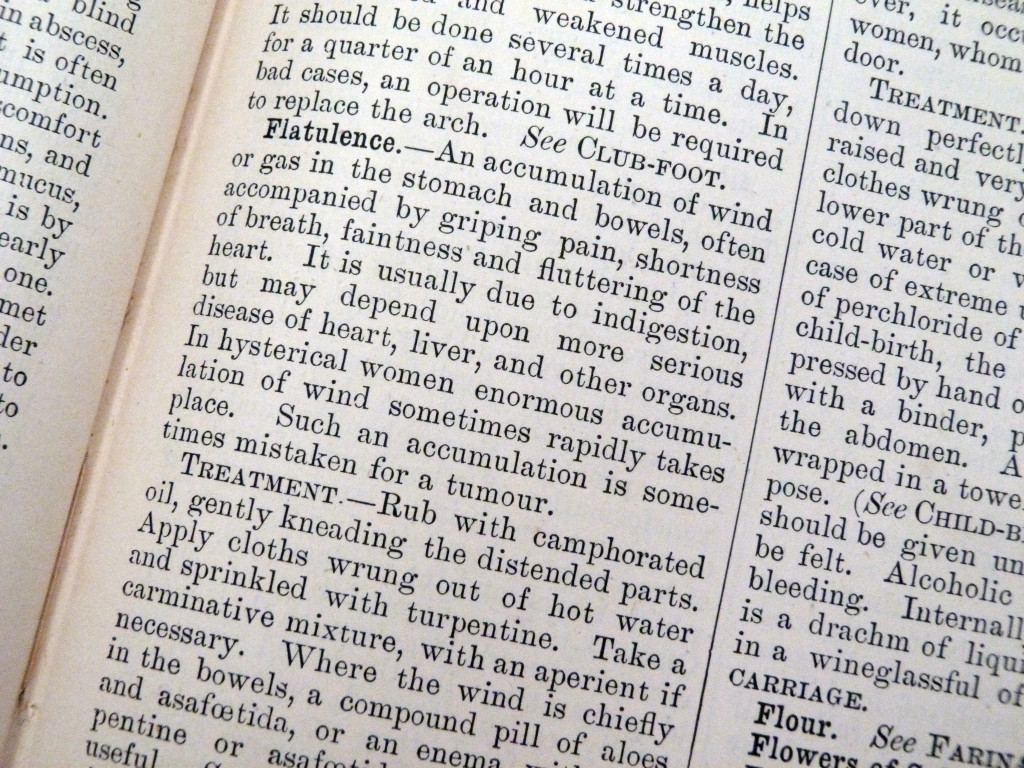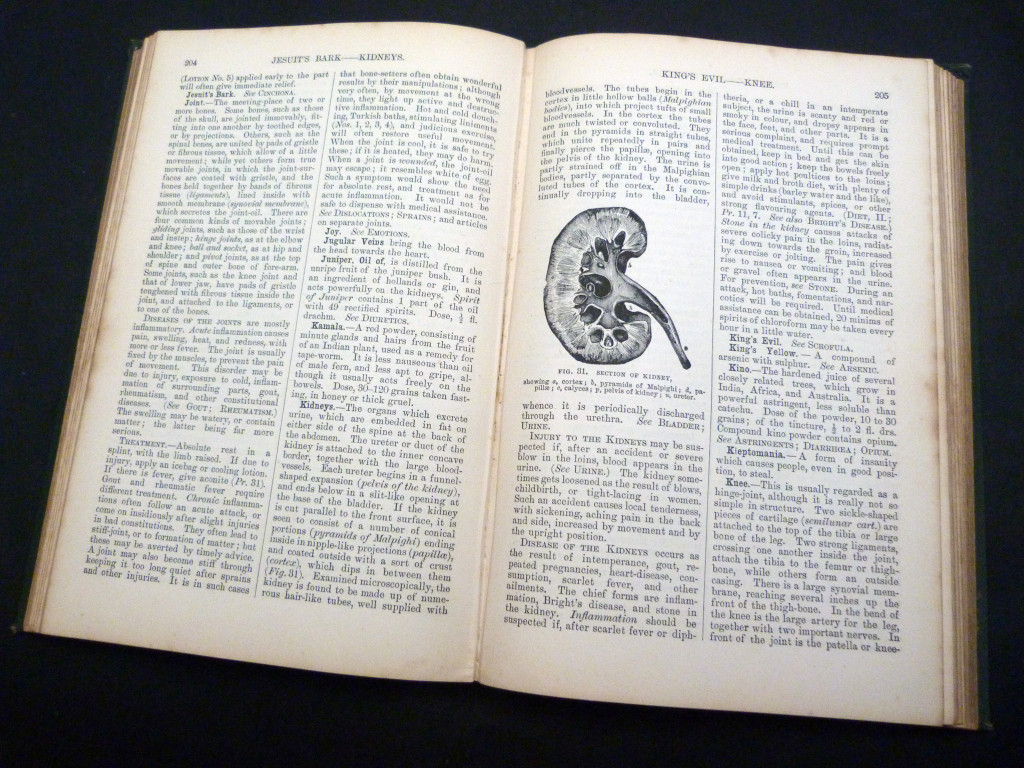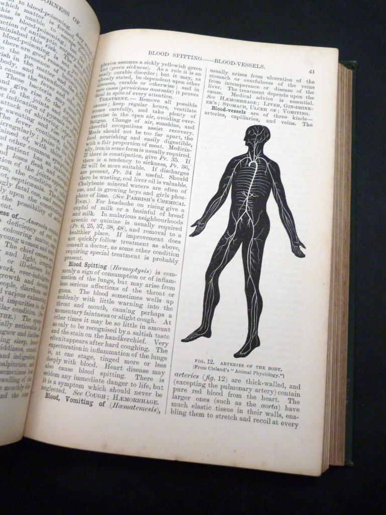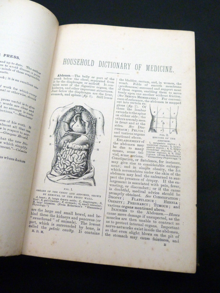 An alphabetical guide to the body, health and treatments with occasional illustration. The author was a doctor who ran open air sanitoriums and specialised in treating phthisis (pulmonary tuberculosis). The book runs from Abdomen through to Zymotic Diseases via bed pans, ear wax, flatulence, lock-jaw and poisonings!