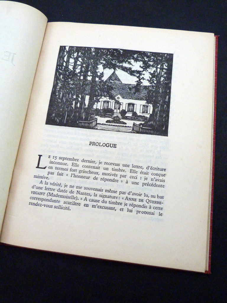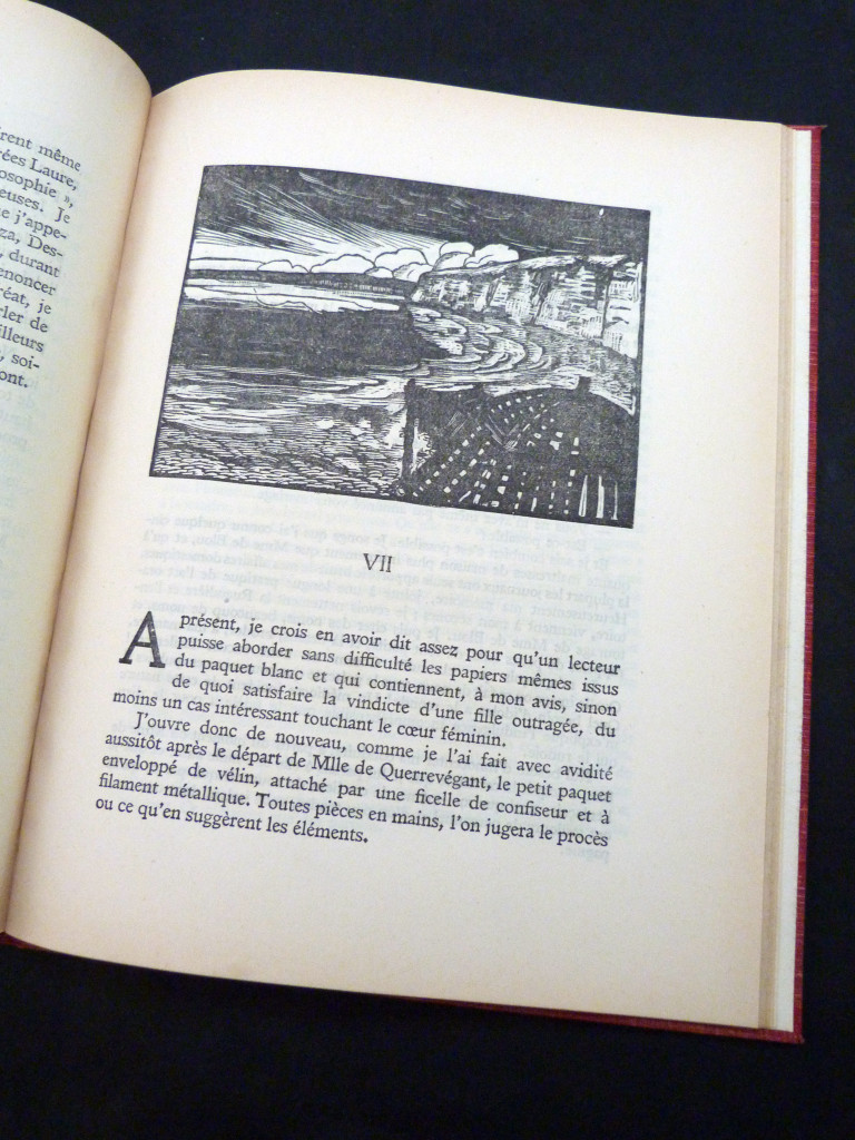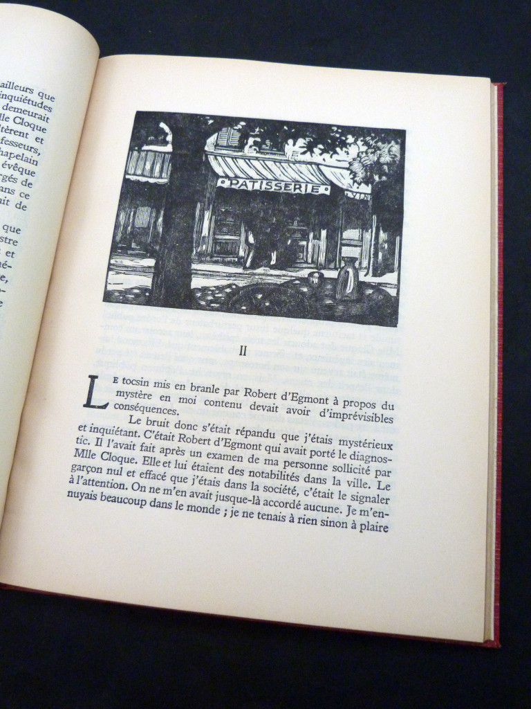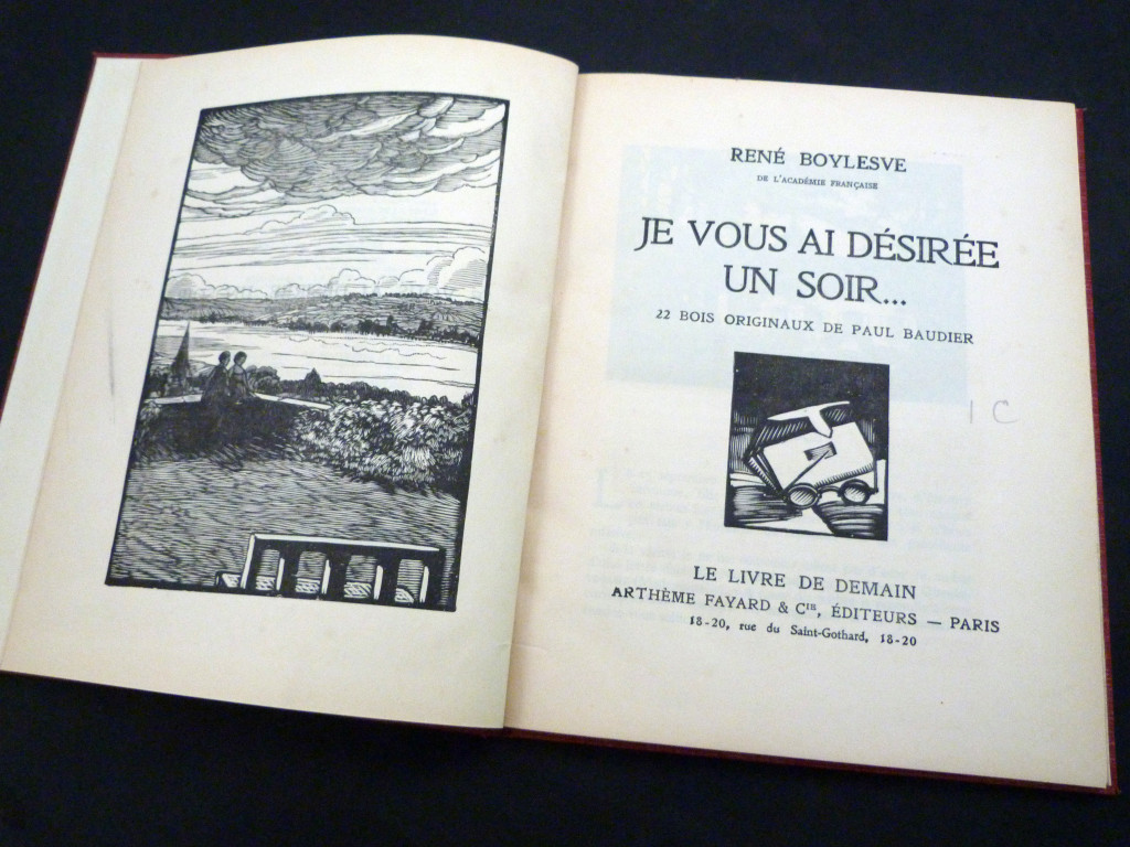 Rene Boylesve's introspective and autobiographical story that revisits the narrator’s adolescent emotional life, particularly his attachment to the figure of Mademoiselle Cloque, who originally appeared in his earlier work Mademoiselle Cloque (1899). This edition illustrated by French artist Paul Baudier with 22 original woodcuts. This title was published in the "Le Livre de Demain" series and would have been bound in yellow paper covers, this one has been rebound in red cloth.