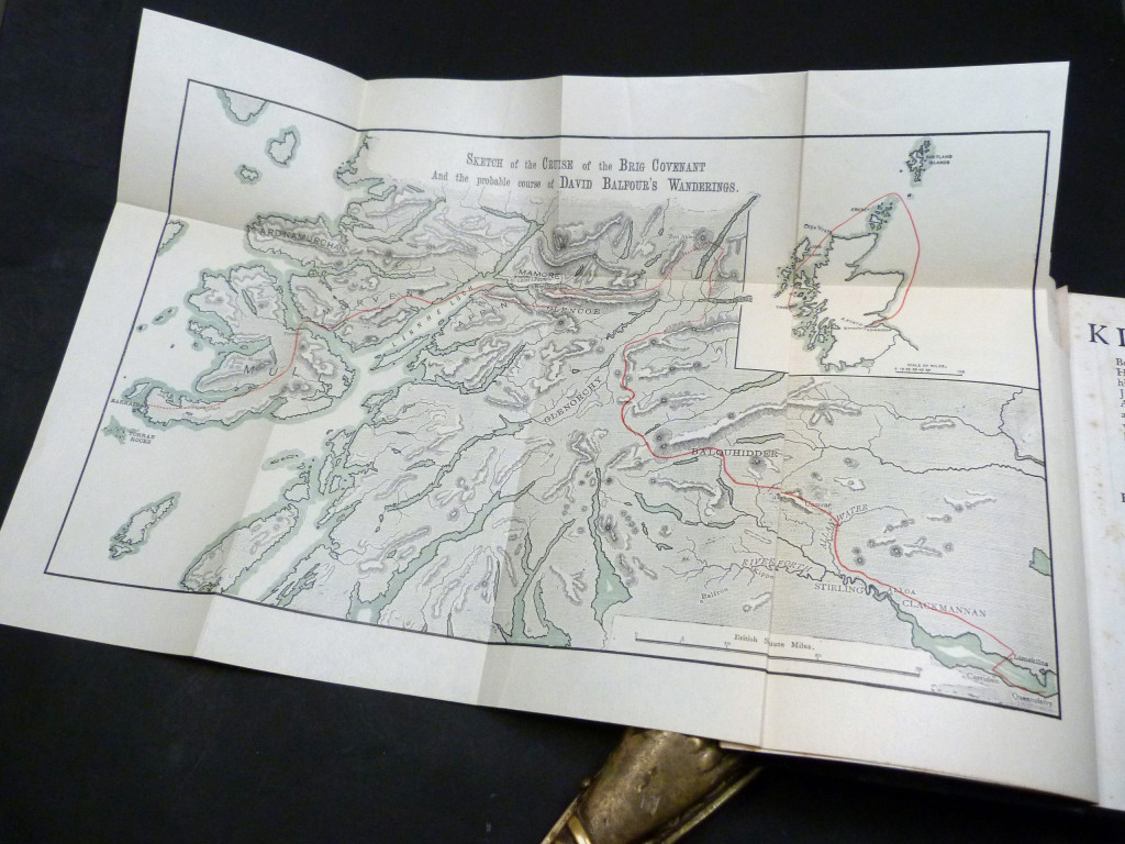 A very attractive copy of Kidnapped. The leather binding is in very good condition, with only very minor bumping to the boards. The contents are in very good condition for age, with light foxing to the title page and margins (mostly around where it faces the folded map). The inner binding is secure and the book is free from inscription.