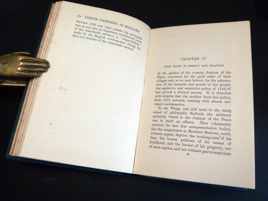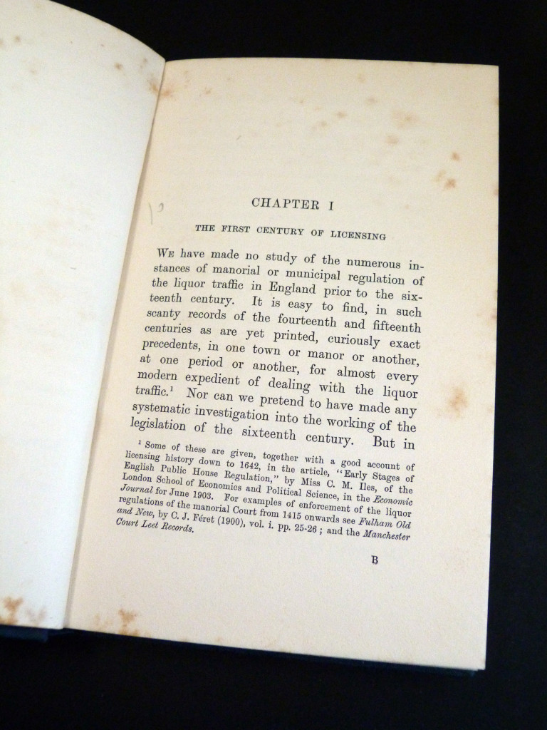 The Webb's history of liquor licensing and local government's approach to it. Chapters: 1. The First Century of Licensing, 2. A Period of Laxness, 3. Regulation and Suppression, 4. Free Trade in Theory and Practice, 5. Legislative Repentance, 6. The Movement for the Reformation of Manners.