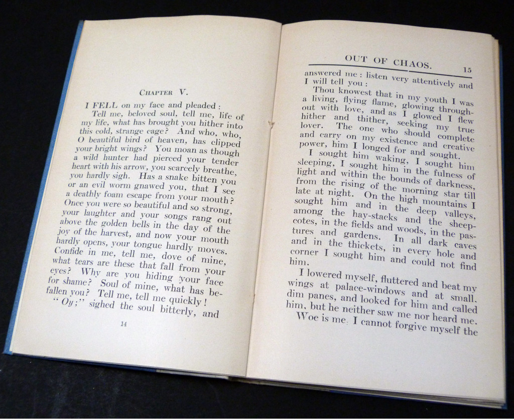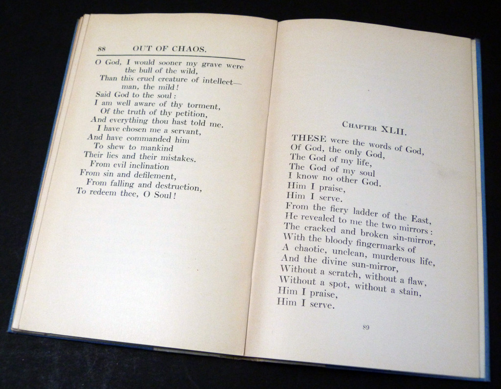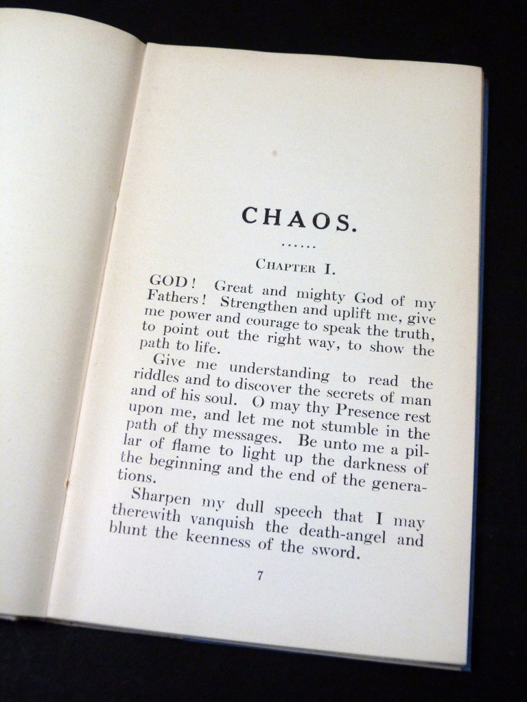 First published in Yiddish in 1917 as Aroys fun Khaos, and is a collection of writings and poems praising God. The author was a Yiddish writer, artist, sculptor, and gem expert, born in Skempe, Poland and came to England in 1903.
