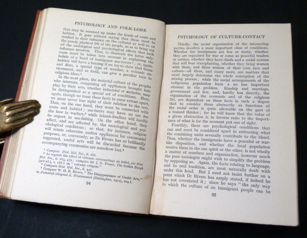 Contents: 1. Psychology and Folk-Lore; 2. War and Savagery; 3. Primitive Values; 4. The Psychology of Culture-Contact; 5. The Transvaluation of Culture; 6. The Interpretation of Survivals; 7. Origin and Validity in Religion; 8. Magic or Religion?; 9. The Primitive Medicine-Man; 10. Progress in Prehistoric Times; 11. Anthropology and University Education.