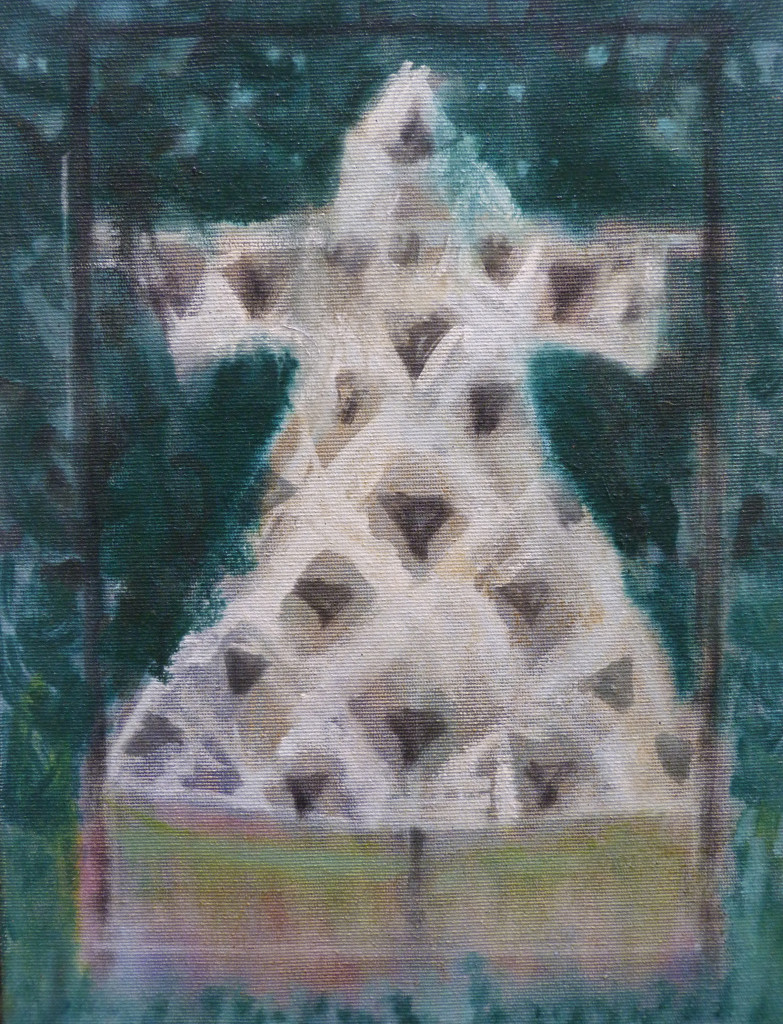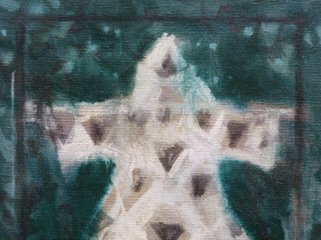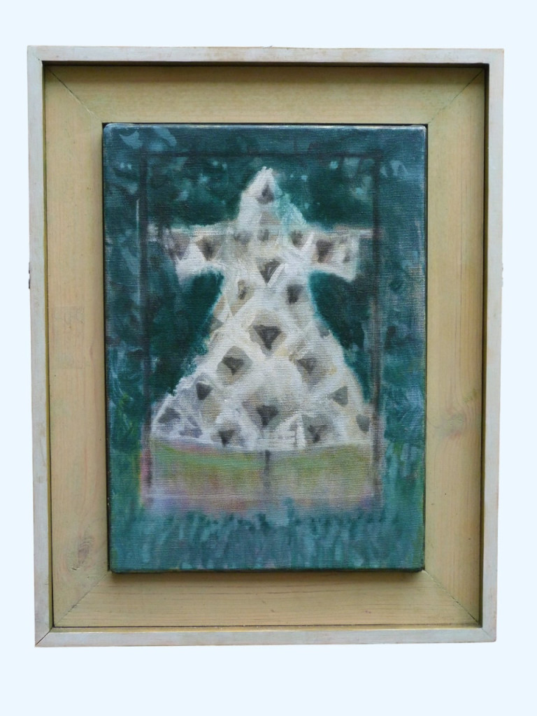 Painted in 1988, this is an oil on canvas in a bespoke wooden frame (it is not glazed). The frames has been gently coloured with shades of green to complement the painting. The frame measures 47 × 36.5cm and the painting is 35 × 25cm.