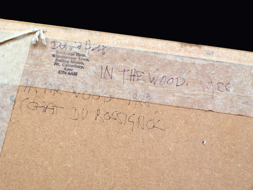 This painting is titled "In the Wood", and, unusually for David, has a subtitle "Chant du Rossignol" (The Song of the Nightingale). The painting has quite a bit behind its creation, it features a large central white figure, almost ritualistic in appearance, with arms outstretched, in the manner of a cloaked Vitruvian man. That figure is based on both the ghostly forms that are seen in woodlands at night, but also the towering shapes of the pylons that carve a path through part of the Kentish landscape. The pylons emit a low hum, which is what caused David to subtitle the painting. Stravinsky's Chant du Rossignol is a poeme symphonique taken from his opera The Nightingale, one of the themes of the work is the natural versus the artificial, with the sound emanating from the pylons being in conflict (or harmony) with the nightingales.