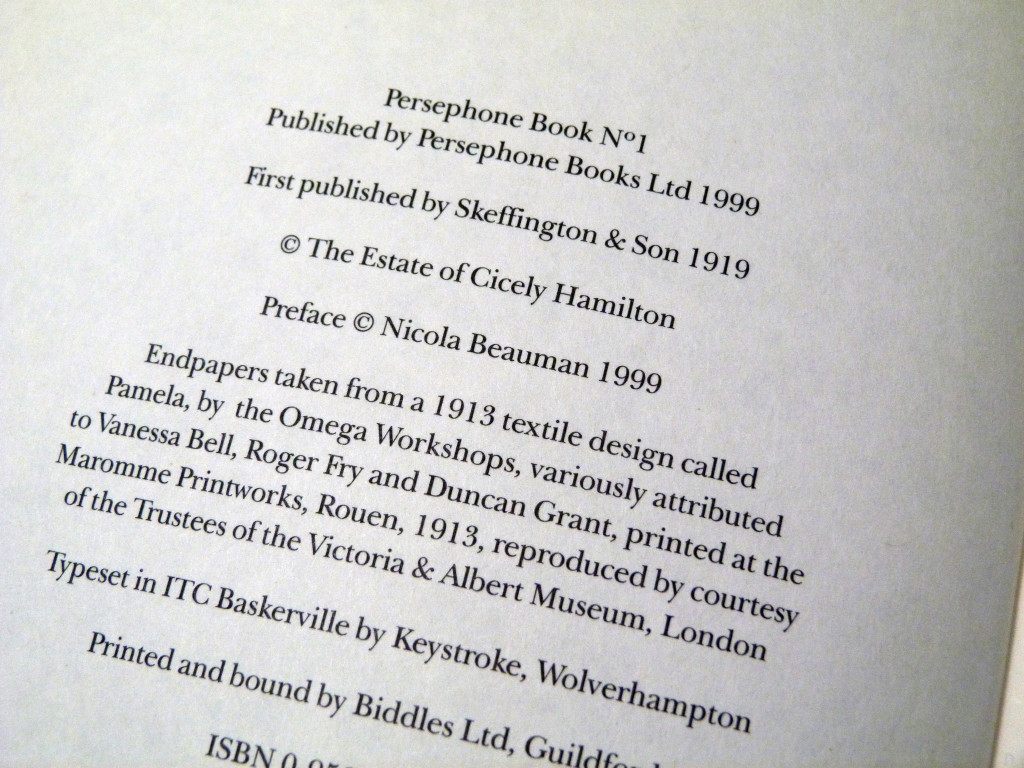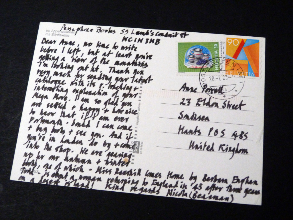 The first book published by Persephone Books with a handwritten postcard from Nicola Beauman, the founder and author