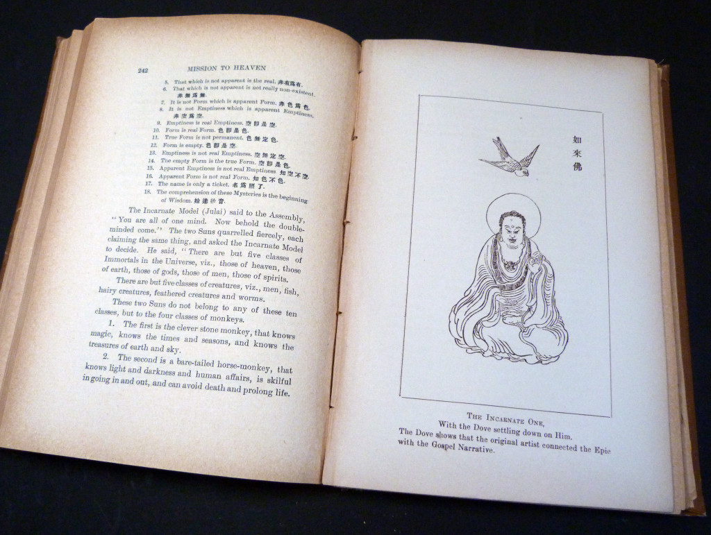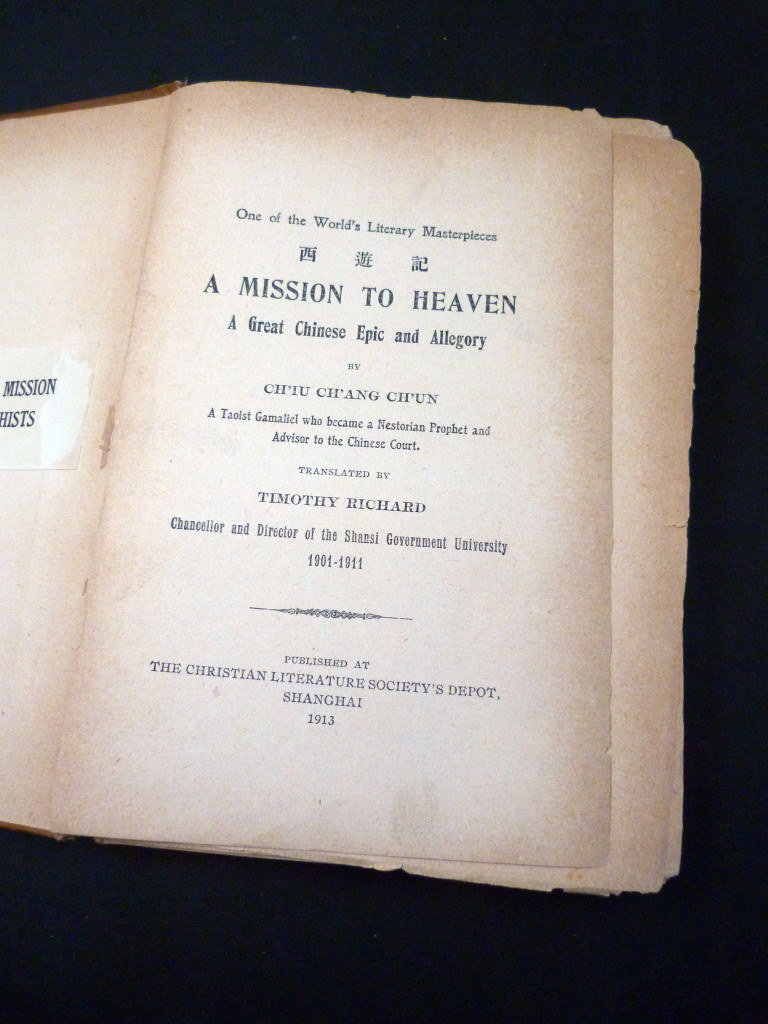 A Mission to Heaven (1913) was the first English version of Journey to the West, a 16th century Chinese novel by Ch'iu Ch'ang Ch'un (Timothy Richard's translation), also known as Wu Cheng'en, a novelist and poet of the Ming dynasty (1368–1644), which relates the adventures of a Tang Dynasty priest Sanzang and his three disciples, Monkey, Pig and Friar Sand, as they travel west in search of Buddhist Sutra. Richard's translation condenses the book to 362 pages, whereas the original was much longer. Illustrated with line drawings.