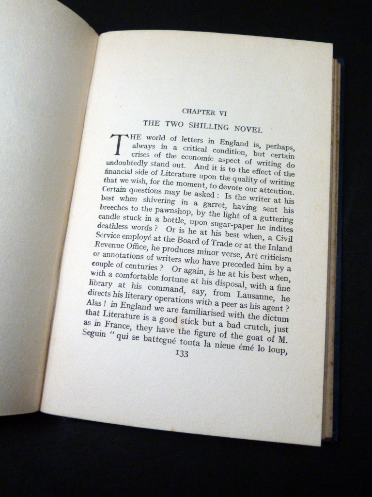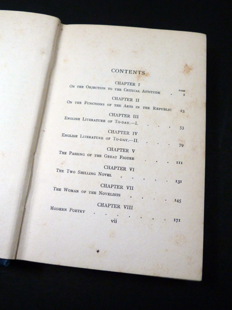 A series of eight critical essays, first issued in 1911. Contents: 1. On the Objection to the Critical Attitude, 2. On the Functions of the Arts in the Republic, 3. English Literature of To-day—I, 4. English Literature of To-day—II, 5. The Passing of the Great Figure, 6. The Two Shilling Novel, 7. The Woman of the Novelists, 8. Modern Poetry.