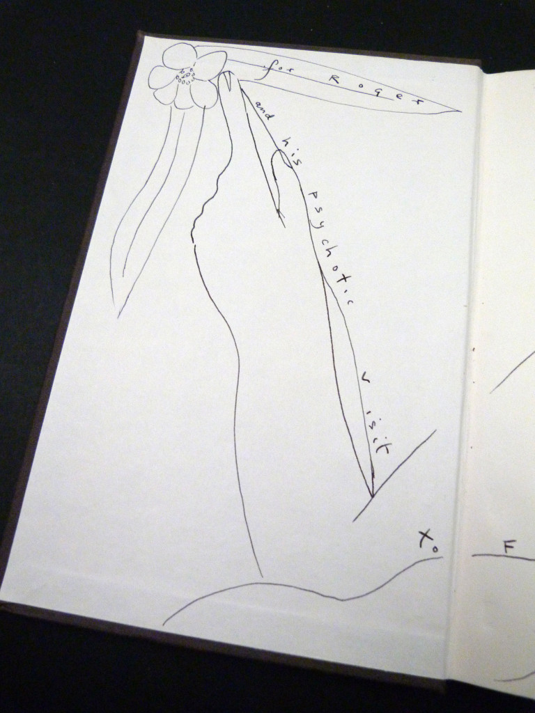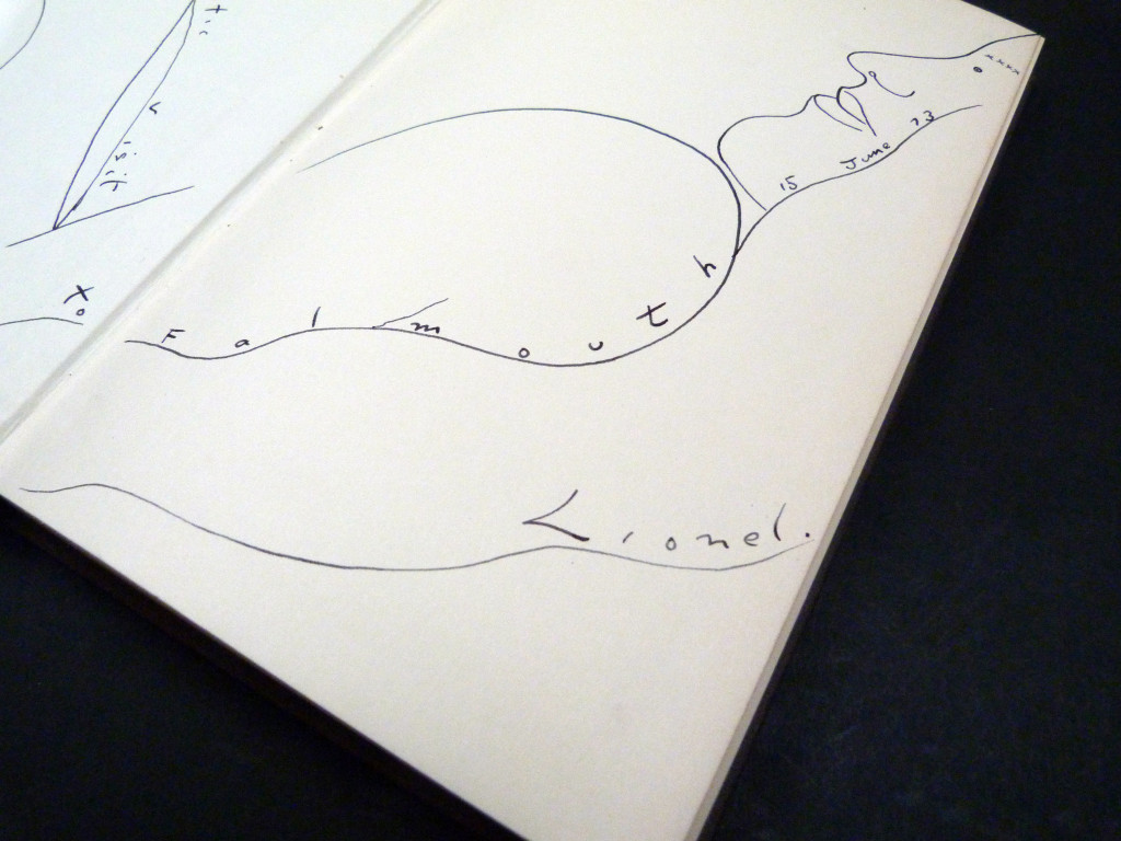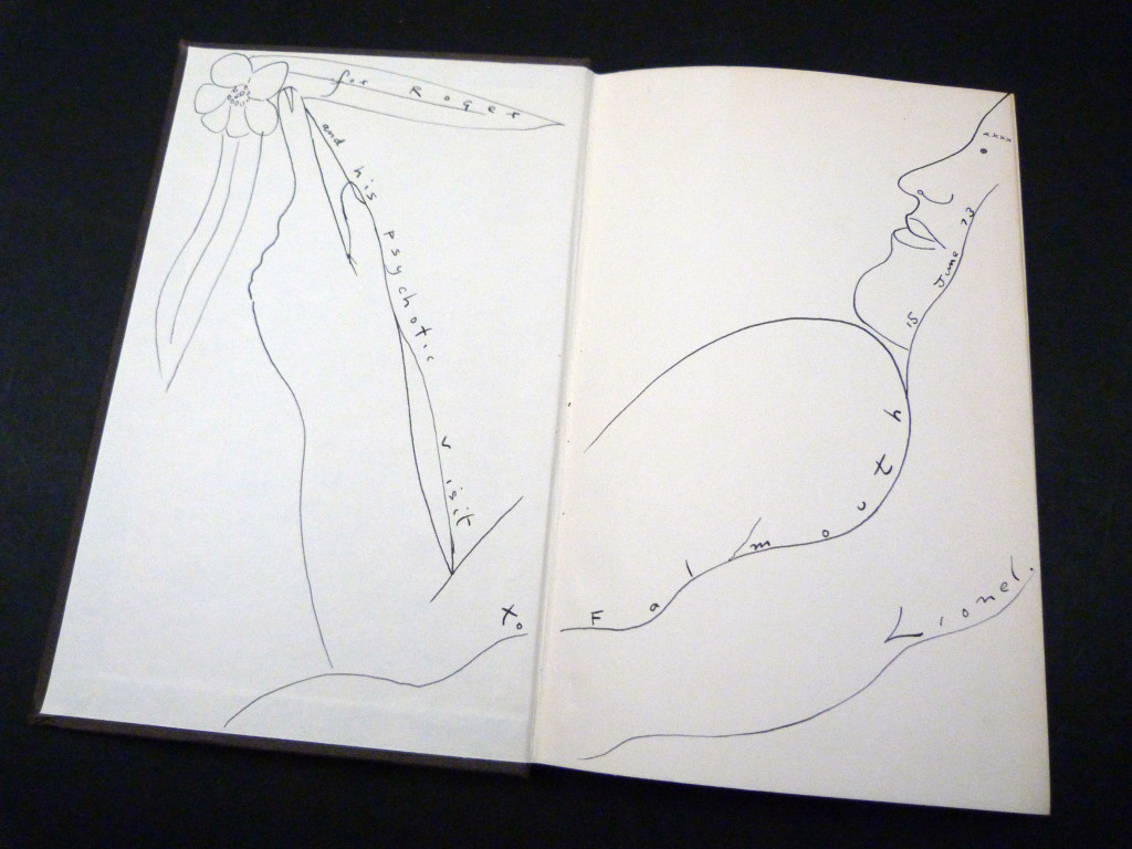 This copy from the library of art historian Roger Cardinal who originated the phrase 'Outsider Art'. Lionel Miskin has drawn a rather wonderful reclining figure holding a flower to the front pastedown and ffep, and has handwritten "for Roger and his psychotic visit to Falmouth 15 June 73, Lionel" along the curves of the body.