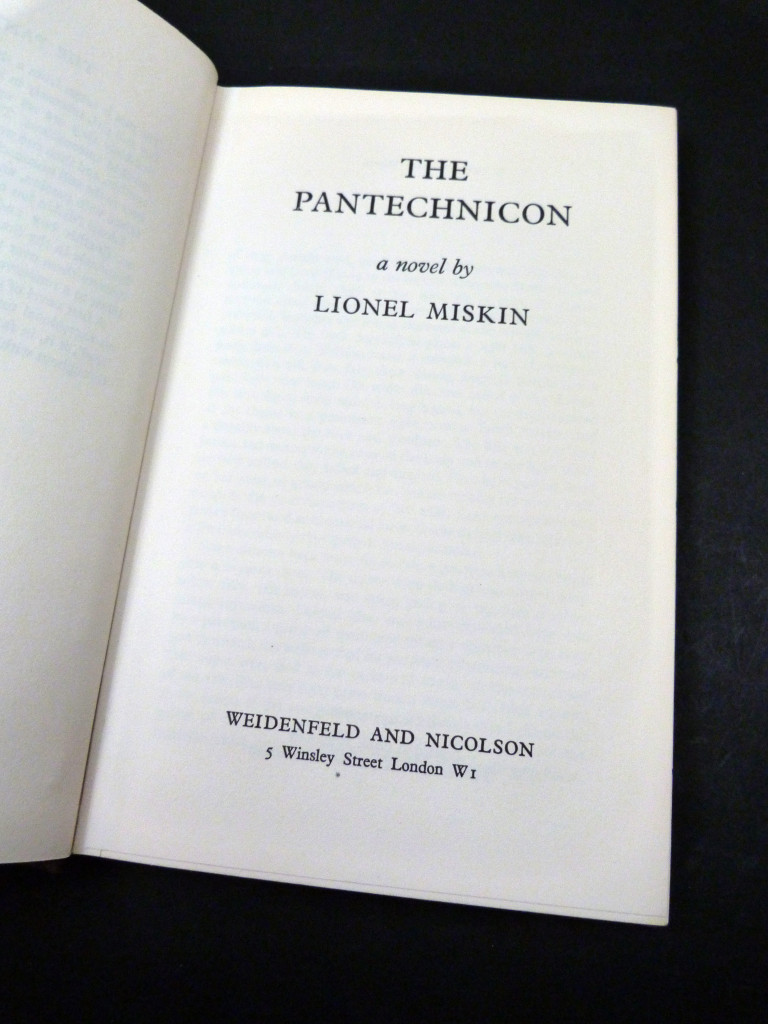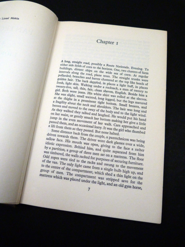 Artist Lionel Miskin's first (and only) novel. It is about perception; its nature, its limits and its embodiment in the two arts of painting and writing. 'Eyes,' says Mr Miskin, who speaks on these topics unabashedly ex cathedra, 'are notorious deceivers. They see what they already know, that which they have seen before and noted down in their visual cabinet of memories.' Furthermore: 'The mind of Jules [the driver of the pantechnicon], like all minds, was an obsessional machine.'