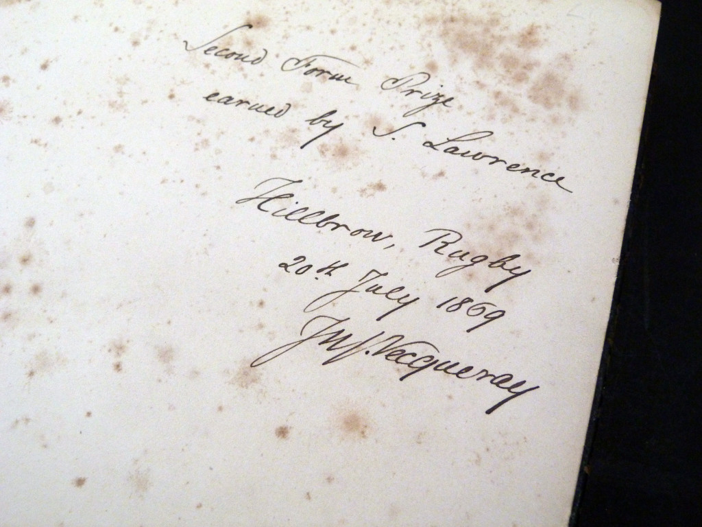A school prize inscription to the ffep shows this copy was awarded by J W J Vecqueray, the founder of Hillbrow School in Rugby, and master at Rugby School, and awarded in 1869 to S Lawrence.