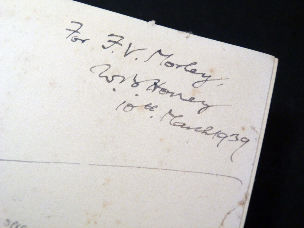 This copy has been signed by W B Honey to F V Morley. Morley (1899–1980), brother of Christopher, was an American mathematician and publishing executive who played an important role at Faber.