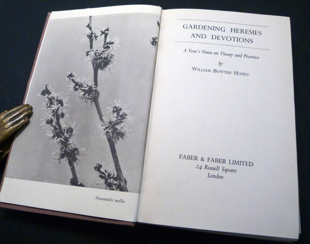 From the dustwrapper, "Provocative and unusual, Mr Honey's book will gladden the heart and fortify the preferences of every genuine gardener and garden-lover. For his heresies are heresies of a healthy revolt against false fashions. Take, for instance, his attitude to colour. Colour, he holds, should mean much more than the colour of teh flowers only. Instead of the customary 'blaze of colour', he would have the garden rich in harmonies and contrasts of tone, in which foliage plays its part as well as flowers.