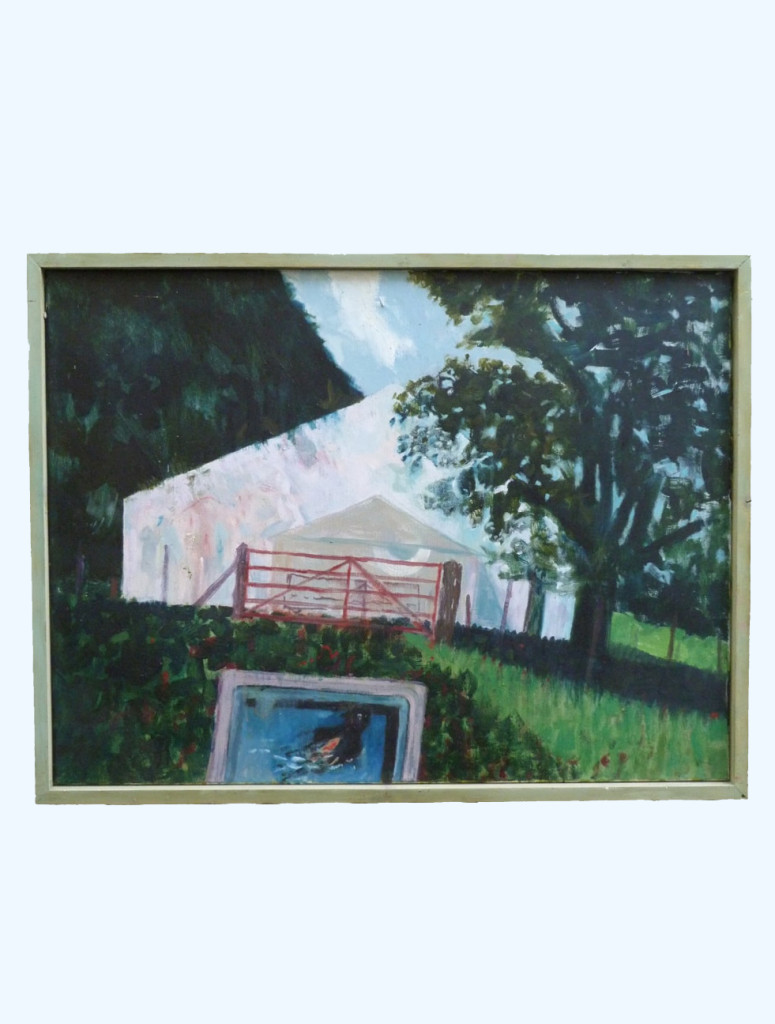 Painted in July 2002, this is a large oil on canvas, framed (but not glazed). The frame measures 64cm × 84cm, and the frame has a width of just under 2cm, and has a light green wash by the artist to complement the painting.