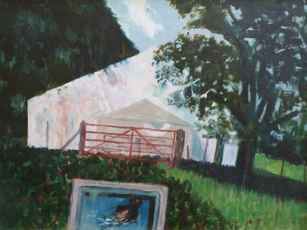 This is David's painting of an English summer in the Kentish countryside. A marquee can be seen nestling in between the trees with a red gate before it. In the foreground, a blackbird washes in a bird bath. David's use of colours indicate the heat of a July day and the bright blue sky sits in contrast with the deep dark shade thrown by the trees.