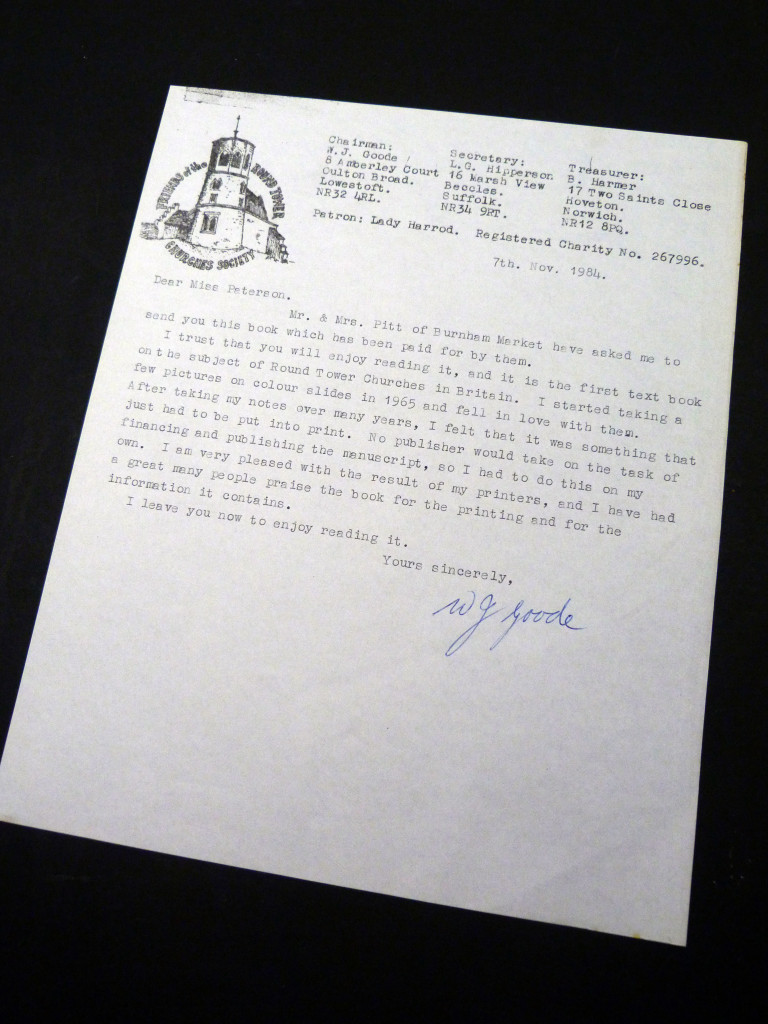 Loosely inserted is a typed letter signed by W J Goode, and some Round Tower Churches Society bumpf.