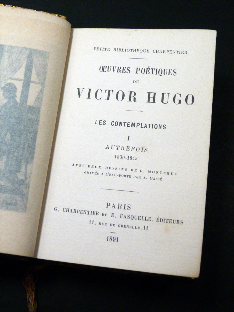 A volume from the Petite Bibliotheque Charpentier of Victor Hugo's poetic works. es Contemplations was first published in 1856 and consists of 156 poems in which Hugo experiments with autobiography in verse. The poems are, at times, intensely reflective, and also forms part homage to his daughter Léopoldine who drowned in the Seine in 1843. The collection is in two parts, firstly Autrefois, which contains poems from 1830 to 1843, and then Aujourd'hui which covers from 1843 to 1855.