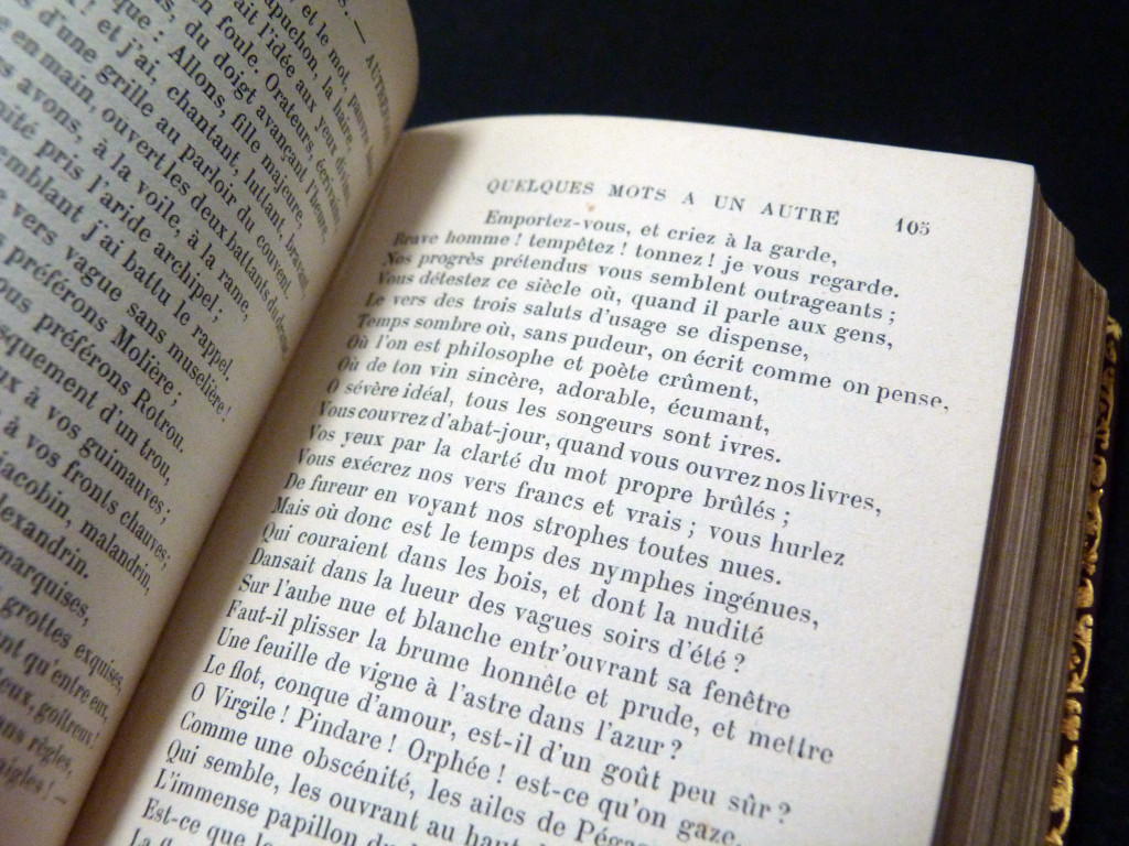 Pocket edition, two volumes (complete) Full leather. Gilt titling and five raised bands to the spine. Inner gilt dentelles, and all edges gilt. 11 × 7.5cm, 351pp & 392pp. French text.