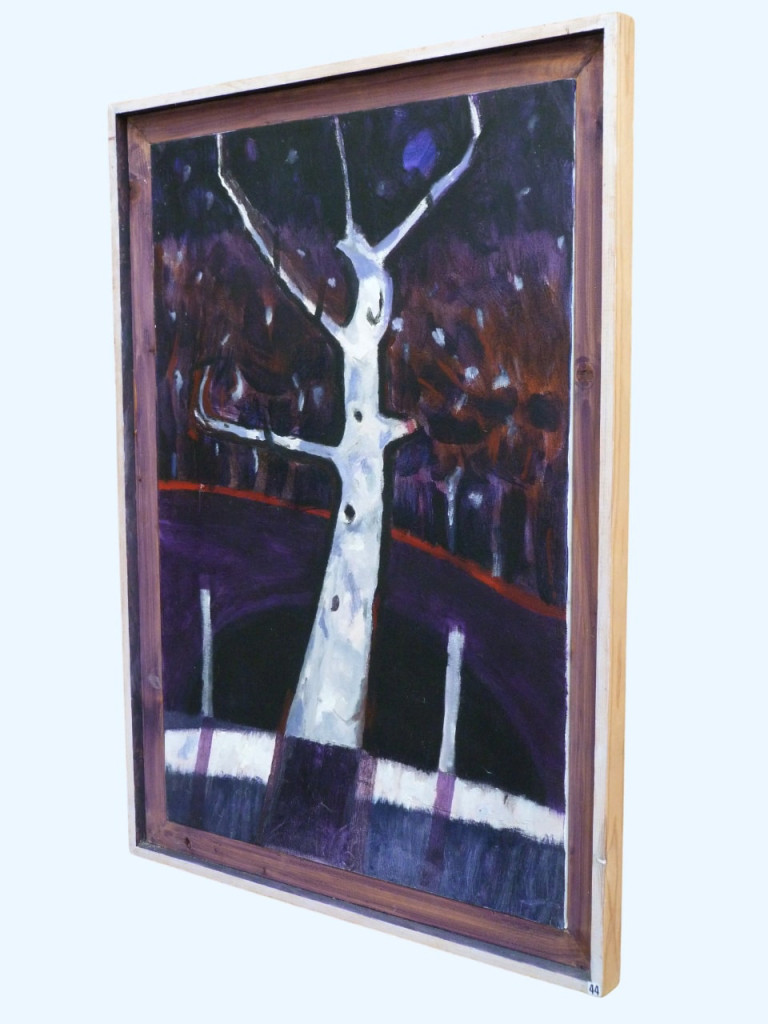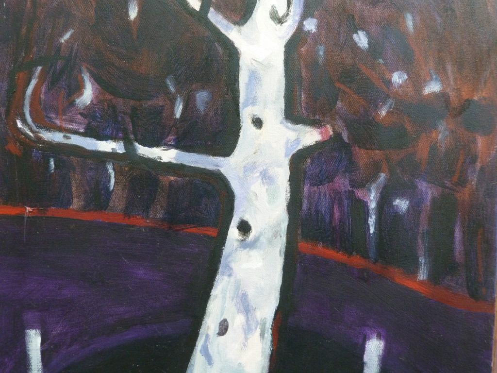 This is a work of abstract expressionism. It depicts a winter tree, stripped bare, cold and white but standing strong, with a night-time forest behind which is in deep purples, blues and blacks, standing in contrast with the white trunk of the tree. A few flashes of brighter colour appear in the tree line of the forest.